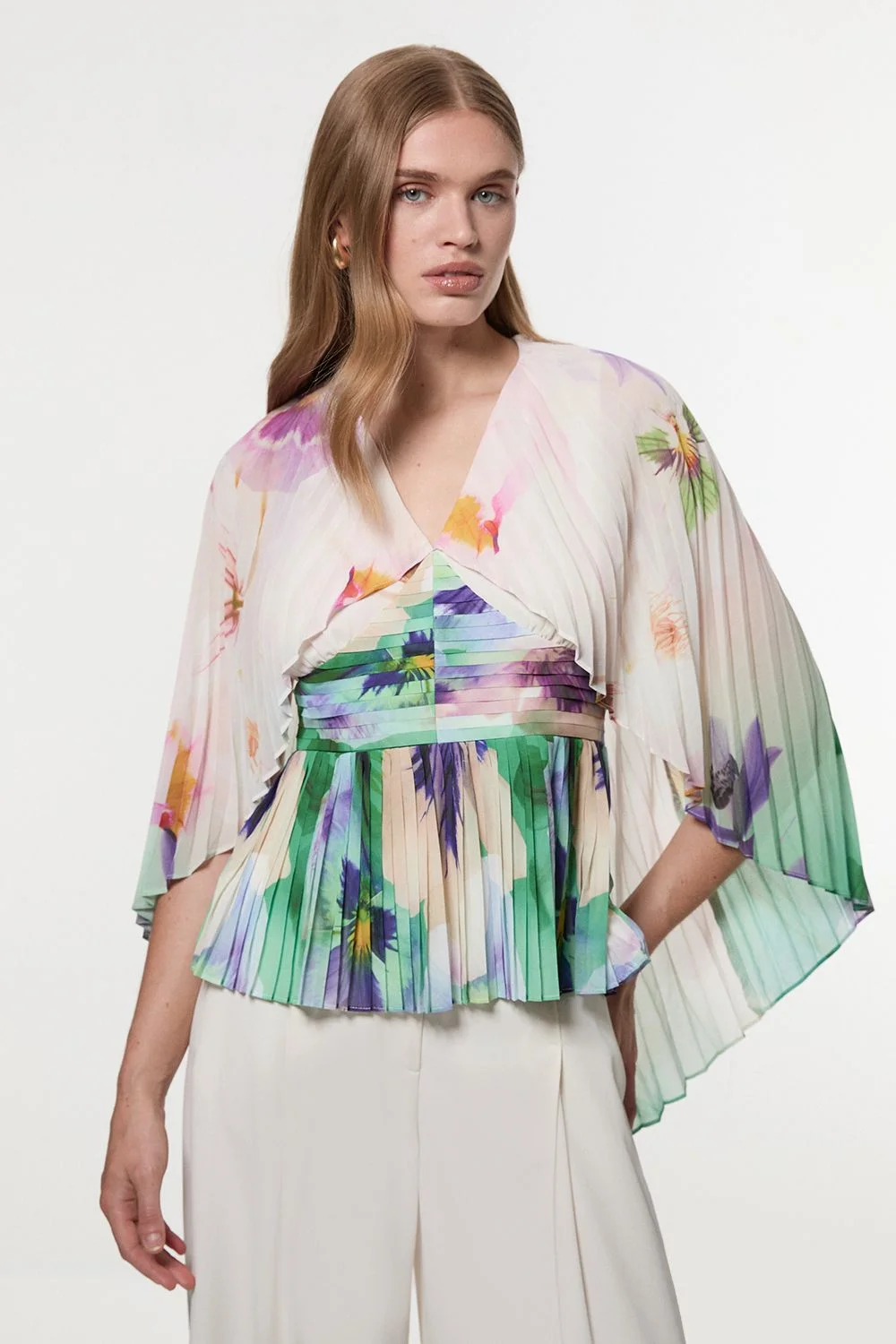 Make a statement at your next special occasion with this exquisitely crafted pleated top from Karen Millen. The flowing cape sleeves create a graceful silhouette while the plunge neckline adds sophisticated allure. The artistic floral pattern brings a dreamy, ethereal quality that commands attention. Style with tailored cream trousers for elegant garden parties or summer weddings. For evening events, pair with sleek cigarette trousers and strappy heels. The loose fit and flowing fabric ensure you'll remain comfortable throughout any event, whilst the pleated texture adds dimension and visual interest. This versatile piece transitions from daytime celebrations to evening soirees with just a change of accessories. Dramatic cape sleeves with all-over pleating Plunge neckline Vibrant floral pattern High-low hemline Product Details & Care Main: 100% Polyester. Lining: 100% Polyester. Wash inside out. Wash with similar colours. Iron on reverse. Do not bleach. Do not tumble dry. Remove promptly from machine machine. Dry on a hanger. Do not wring. Model wears UK Size 8/ US Size 4. Model height approx: 5"9. Length approx: 60cm