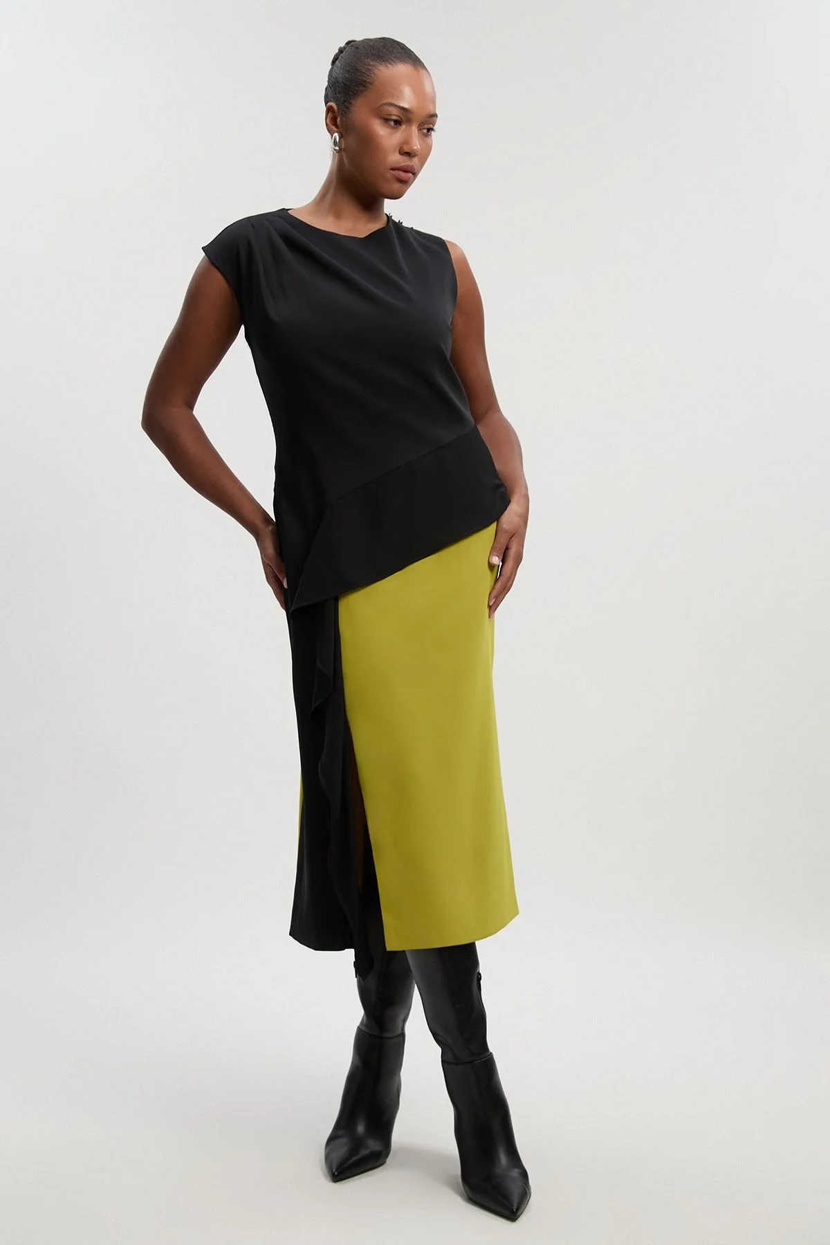 - Striking asymmetric neckline creates a modern, architectural silhouette - Elegant draped waist detail adds flattering dimension and visual interest - Soft tailoring ensures comfort whilst maintaining a polished appearance - Midi length offers versatile styling options for various daytime occasions - Contrast colour blocking design creates a contemporary, artistic aesthetic This Karen Millen midi dress exemplifies sophisticated daywear with its thoughtful design elements. The asymmetric neckline and draped waist detail work in harmony to create a figure-enhancing silhouette that's both contemporary and flattering for curvier frames. Style with leather ankle boots for an effortlessly chic look perfect for family gatherings or weekend brunches. The soft tailoring allows for comfortable movement throughout the day whilst maintaining a structured appearance. For casual events, pair with a cropped denim jacket and statement earrings, or layer with a lightweight cardigan for cooler days. The colour blocking design adds artistic flair to your wardrobe, making this piece a standout option that transitions seamlessly from day to evening casual settings. Complete the look with a structured tote bag for a polished finish that reflects the Karen Millen aesthetic of expert craftsmanship and contemporary elegance. Product Details & Care Main 1: 100% Polyester, Main 2: 100% Polyester, Lining: 100% Polyester Do not wash, do not bleach, do not tumble dry, cool iron on reverse, dry clean only in mild solvent, keep away from fire Model wears: UK18 /US14. Models height approx: 5"9. Length approx: 125cm.
