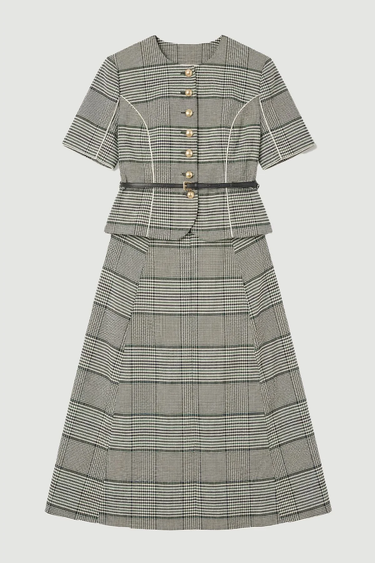 - Tailored check pattern throughout with structured peplum silhouette for a defined waistline - Elegant collared neckline with button-through front detail adding sophisticated charm - Short sleeves provide versatility for seasonal styling and layering options - Belted design accentuates the waist for a flattering, feminine shape - Mini length offers a contemporary twist on classic tailoring, perfect for occasion wear This Karen Millen tailored check dress embodies refined craftsmanship with its structured peplum silhouette and belted waist. The classic check pattern presents a timeless aesthetic whilst the button-through front adds a touch of heritage-inspired detailing. Style with pointed court shoes and a structured clutch for formal events such as weddings or race days. For a more contemporary approach, pair with block-heeled ankle boots and a tailored blazer for important work engagements. The collared neckline and mini length strike the perfect balance between tradition and modernity, making this dress an excellent choice for graduation ceremonies or sophisticated afternoon gatherings. The thoughtful design allows for customisation with statement jewellery to transition effortlessly from day to evening occasions. Product Details & Care Shell: 63% Polyester, 34% Viscose/Rayon, 3% Elastane, Lining: 100% Polyester, Wash with similar colours, Wash inside out, Iron on reverse, Do not bleach, Do not tumble dry. Model wears UK 18/ US 16. Length Approx: 136cm