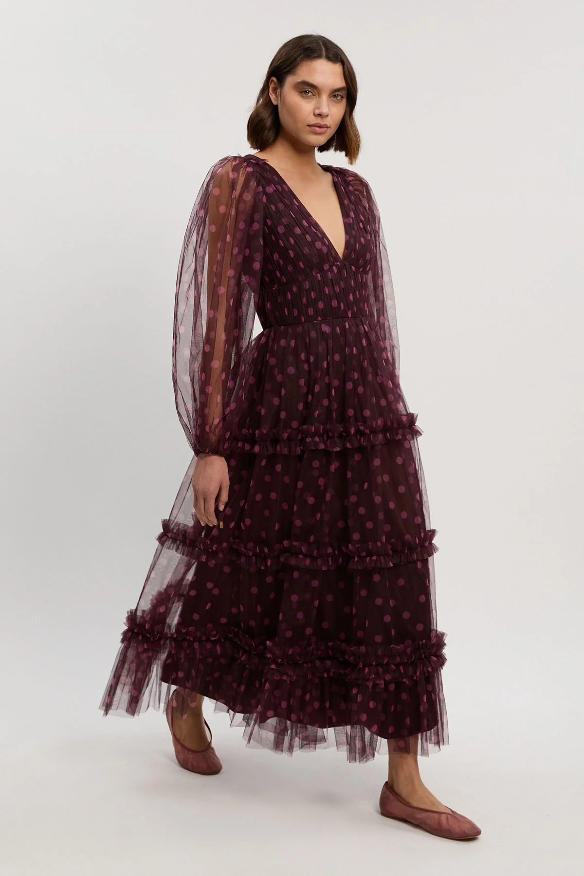 Polka Dot Tulle Plunge Balloon Sleeve Maxi Dress