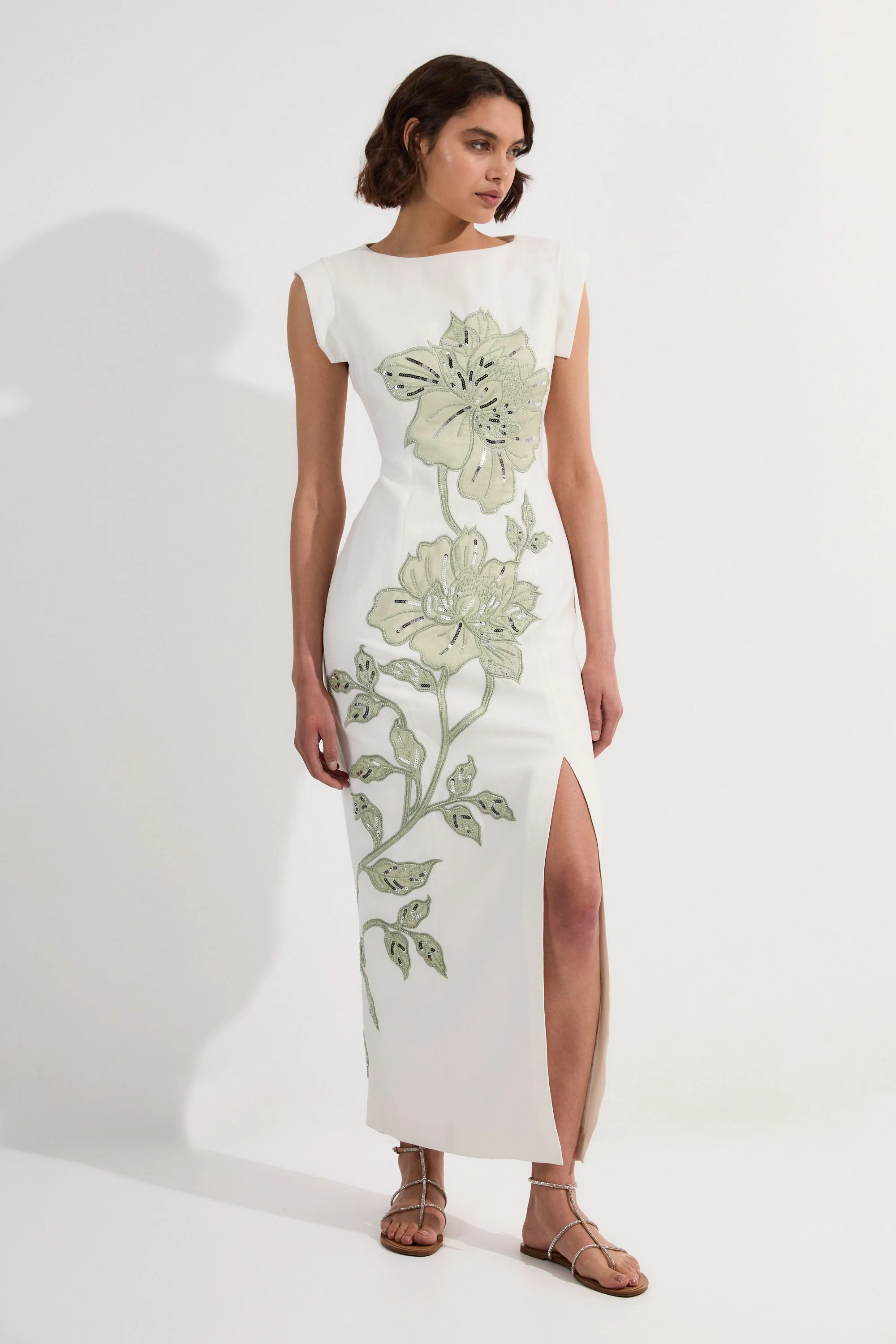 Make a statement at your next formal event with this exquisite Karen Millen maxi dress. The stunning floral applique, adorned with delicate beadwork, creates a captivating focal point against the crisp backdrop. The tailored fit accentuates your silhouette, while the side slit adds a touch of drama and allows for graceful movement. Pair with strappy heels and a clutch for a polished look at weddings or race days. For a more relaxed yet equally stylish ensemble, opt for metallic flat sandals and statement earrings. The versatile boat neckline provides the perfect canvas for showcasing an elegant updo or letting your hair cascade naturally. This dress is a true investment piece that will have you turning heads at summer soirees and special occasions for years to come. Striking floral applique detailing with intricate beadwork Elegant boat neckline for a sophisticated look Tailored silhouette with a flattering maxi length Side slit for ease of movement and added allure Sleeveless design perfect for summer occasions Product Details & Care 54% linen, 46% viscose. Lining 100% cotton. Dry clean only. Model wears UK8/US4. Model height 5"9. Length approx: 130cm