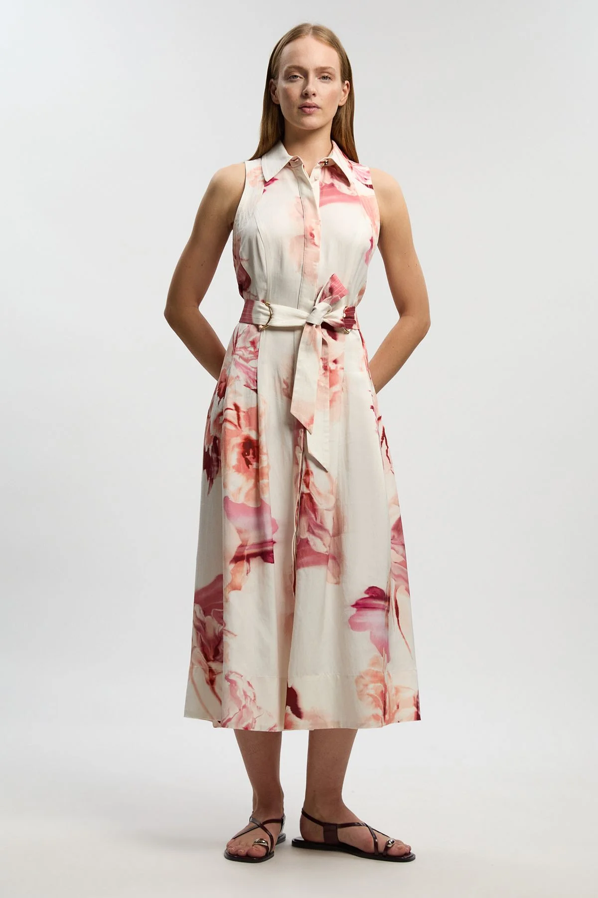 - Elegant halter neck design with sophisticated collared neckline - Distinctive floral pattern with artful top stitching detail - Flattering midi length falling approximately 128cm - Refined D-ring belt detail to accentuate the waist - Sleeveless silhouette perfect for warm-weather occasions This exquisitely crafted midi dress showcases the refined craftsmanship synonymous with Karen Millen. The collared halter neck design offers a contemporary twist on classic occasion wear, whilst the floral pattern adds a touch of feminine charm. The D-ring belt detail creates a defined silhouette, allowing you to customise the fit to your preference. Style with delicate strappy sandals for daytime garden parties, or transform for evening events with pointed court shoes and a structured clutch. The viscose-linen blend fabric ensures comfort throughout the day whilst maintaining an impeccable drape. This versatile piece transitions effortlessly from summer weddings to race day events, making it an indispensable addition to your occasion wardrobe that will serve you for seasons to come. Product Details & Care Main: 75% Viscose, 21% lyocell, 4% linen, wash inside out, wash with similar colours, Model wears UK 8/US 4. Model Height 5"9. Length approx: 128cm