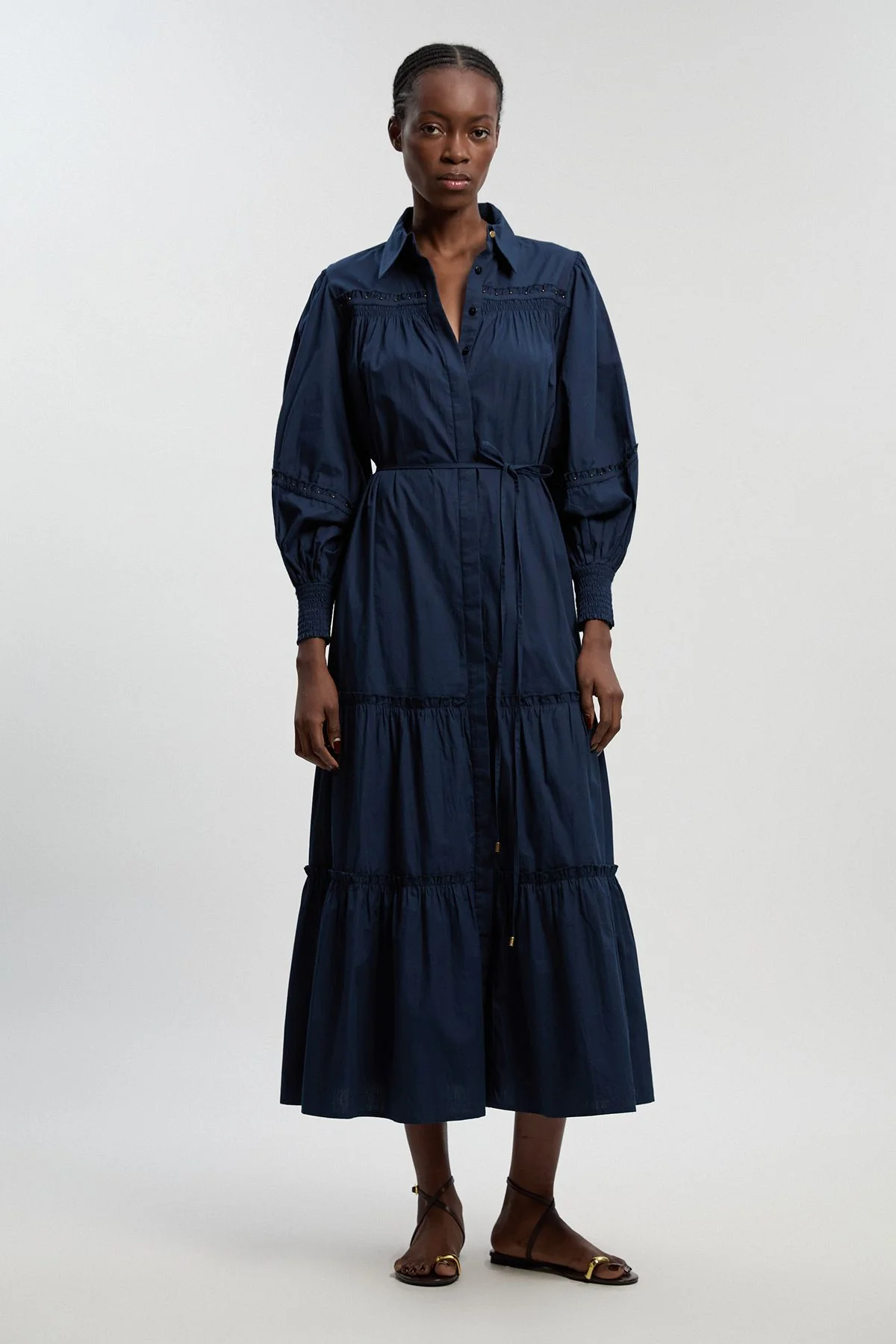 - Crafted from pure cotton for breathable comfort and effortless movement - Elegant shirred detailing across the bodice adds textural interest and refined dimension - Dramatic tiered skirt creates a flowing silhouette with sophisticated volume - Statement balloon sleeves with fitted cuffs offer contemporary structure - Classic shirt collar and button-through design for versatile styling options This tiered shirt dress embodies relaxed sophistication with its thoughtful design elements. The shirred bodice creates gentle texture while the dramatic tiered skirt delivers movement and presence. The structured collar and full sleeves balance the flowing silhouette beautifully, making this piece both contemporary and timeless. Style with flat leather sandals for daytime engagements or elevate with block-heeled mules for garden parties and summer soirees. For cooler evenings, layer with a tailored blazer and add statement earrings to transition effortlessly from day to evening. This versatile dress works equally well for cultural outings in the city or elegant countryside weekends, offering that perfect balance of comfort and refinement that Karen Millen is renowned for. Product Details & Care 100% Cotton. Wash with similar colours. Wash inside out. Iron on reverse. Model wears UK 8/US 4. Model Height 5"9. Length approx: 140cm