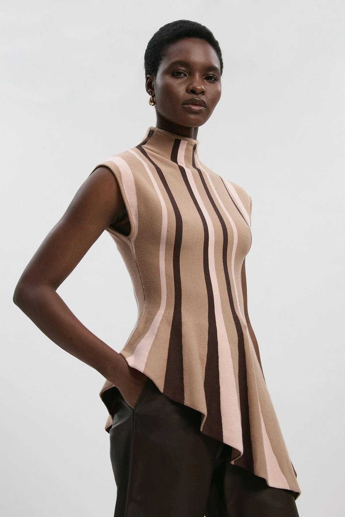This Karen Millen knit top combines timeless stripes with modern asymmetry for a piece that commands attention. The viscose blend fabric ensures a comfortable fit while maintaining structure throughout the day. The high neck and sleeveless design make it ideal for transitional weather. The asymmetric hemline creates visual interest and movement, ensuring you stand out for all the right reasons whilst maintaining the sophisticated edge that defines the Karen Millen aesthetic. Vertical stripe pattern High neck design Sleeveless cut Asymmetric hem Slim fit Product Details & Care Main: 52% Viscose, 28% Polyester, 21% Polyamide. Machine wash. Models wears UK size Small. Models height approx: 5"9.
