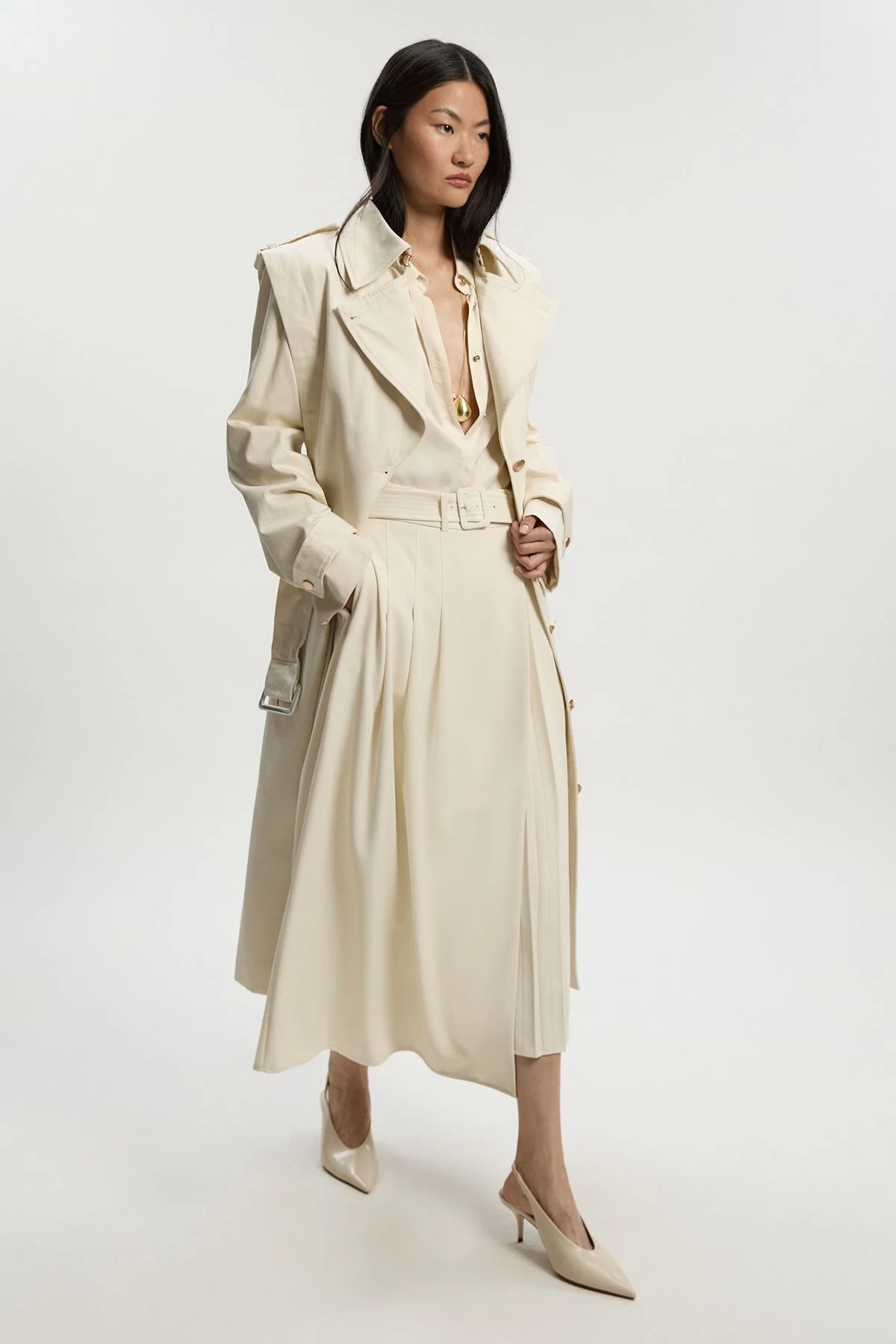 Strong Shoulder Belted Midi Trench Coat