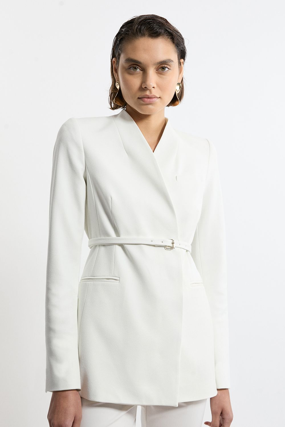 Feel elevated in our collarless blazer, designed to provide a sleek and polished look. Featuring a flattering tailored fit, this blazer is crafted with a belted waist detail that cinches the waist, enhancing your silhouette. Perfect for versatile styling, you can dress it up with your favorite heels and statement jewellery for an evening out, or opt for a more refined look by pairing it with matching tailored trousers for a polished office ensemble. Structured Crepe Check Tailored Collarless Belted Blazer Flattering Tailored Fit Cinching Belted Waistline Collarless Neckline Product Details & Care Main: 59% Recycled Polyester 31% Viscose/Rayon 5% Elastane/Spandex 5% Polyester. Lining: 100% Polyester. Dry clean only. Model wears UK Size 8/ US Size 4. Model height approx: 5"9. Length approx: 75cm