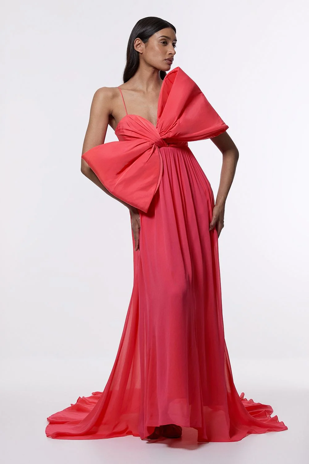 Make a captivating entrance in this Karen Millen Taffeta Bow Detail Woven Maxi Dress. The show-stopping oversized bow creates a sculptural focal point that commands attention, whilst the one-shoulder design offers contemporary asymmetry. The flowing maxi silhouette drapes to the floor, creating graceful movement with every step. Complete your ensemble with strappy heeled sandals and a sleek clutch for formal occasions such as black-tie events, galas or evening weddings. This dress conveys refined drama without overwhelming, the perfect choice for those who appreciate bold yet elegant design. One-shoulder design with oversized bow detail Flowing taffeta fabric Floor-sweeping maxi length Delicate spaghetti strap on one shoulder Fully lined for comfort and structure Product Details & Care Main: 100% Polyester. Lining: 100% Polyester. Wash inside out. Wash with similar colours. Iron on reverse. Do not bleach. Do not tumble dry.