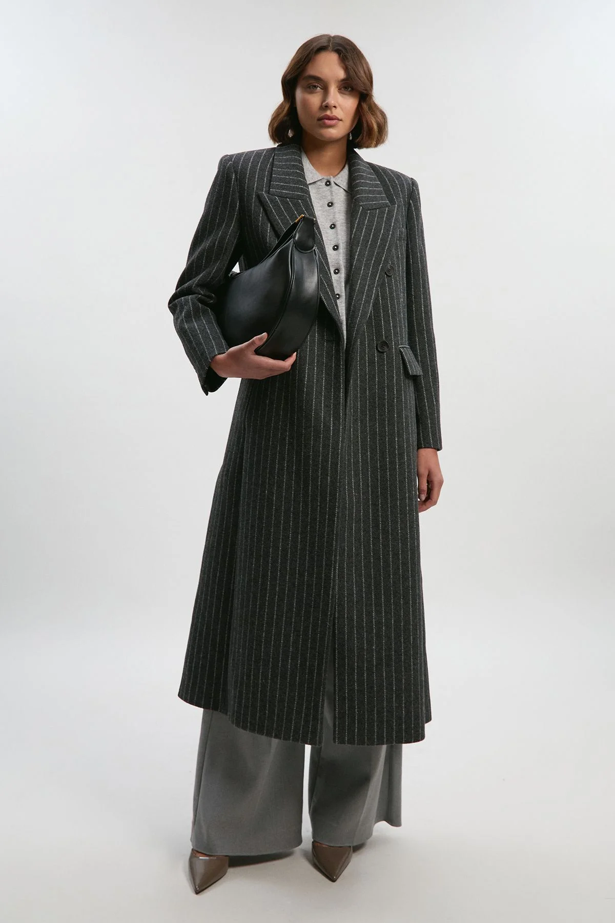 This statement maxi coat showcases timeless tailoring with contemporary proportions. The oversized fit creates a dramatic silhouette whilst the classic pinstripe pattern adds a touch of sartorial refinement. A true investment piece that will remain a cornerstone of your autumn-winter wardrobe for years to come. Tall oversized maxi coat Pinstripe pattern throughout Double-breasted front Tailored wide lapels and defined shoulders Practical side pockets Wool blend fabric Product Details & Care Main: 49% Wool, 46% Polyester, 5% other fibres, Lining: 55% Polyester, 45% Viscose/Rayon, Iron on reverse. Length approx: 140cm
