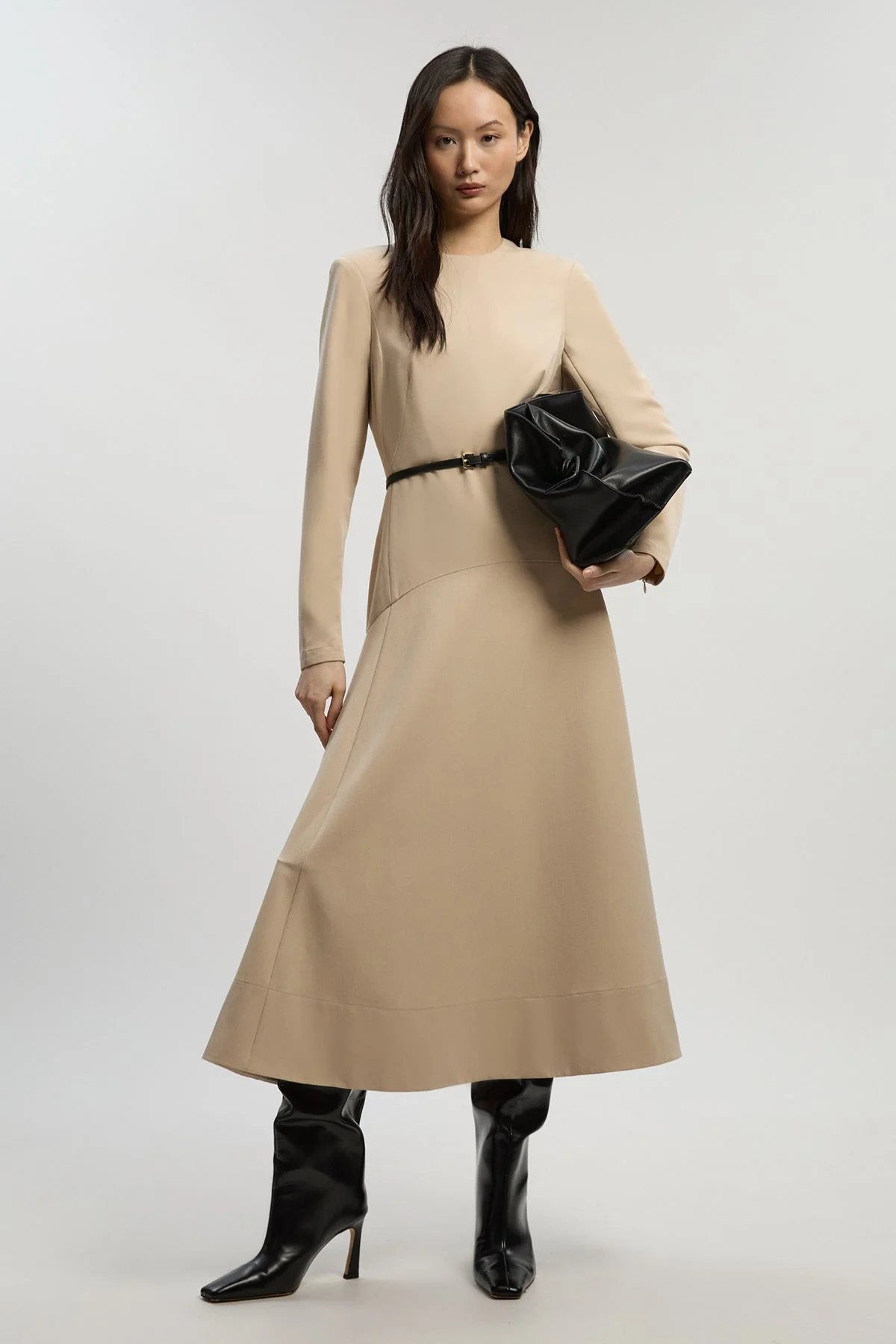 Twill Drop Waist Detail Long Sleeve Belted Woven Midi Dress