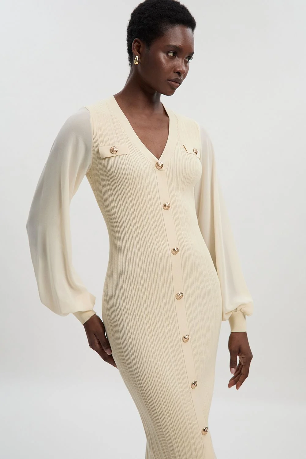 - Elegant rib knit midi dress with contrasting chiffon sleeves for a sophisticated textural mix - Button-up front design with decorative gold-tone buttons adding a refined touch - Figure-flattering silhouette with a subtle front split for ease of movement - Voluminous chiffon sleeves with fitted cuffs creating a dramatic yet wearable silhouette - Versatile midi length perfect for day-to-evening styling transitions This Karen Millen rib knit midi dress masterfully combines comfort with sophistication through its thoughtful design elements. The body-skimming ribbed texture creates a flattering silhouette while the flowing chiffon sleeves add a touch of drama to an otherwise classic piece. Style with minimal gold jewellery and ballet flats for daytime gatherings, or dress up with statement earrings and ankle boots for dinner with friends. The button-up front allows for customisable styling-wear fully fastened for a more conservative look or leave a few buttons undone for a relaxed approach. This versatile piece transitions effortlessly from family brunches to casual workplace settings, making it a cornerstone in your daywear collection. The viscose blend ensures the dress maintains its shape whilst providing comfort throughout the day. Product Details & Care 46% Viscose 30% Polyester 24% Polyamide. Wash with similar colours. Model wears UK S. CB length approx 125cm