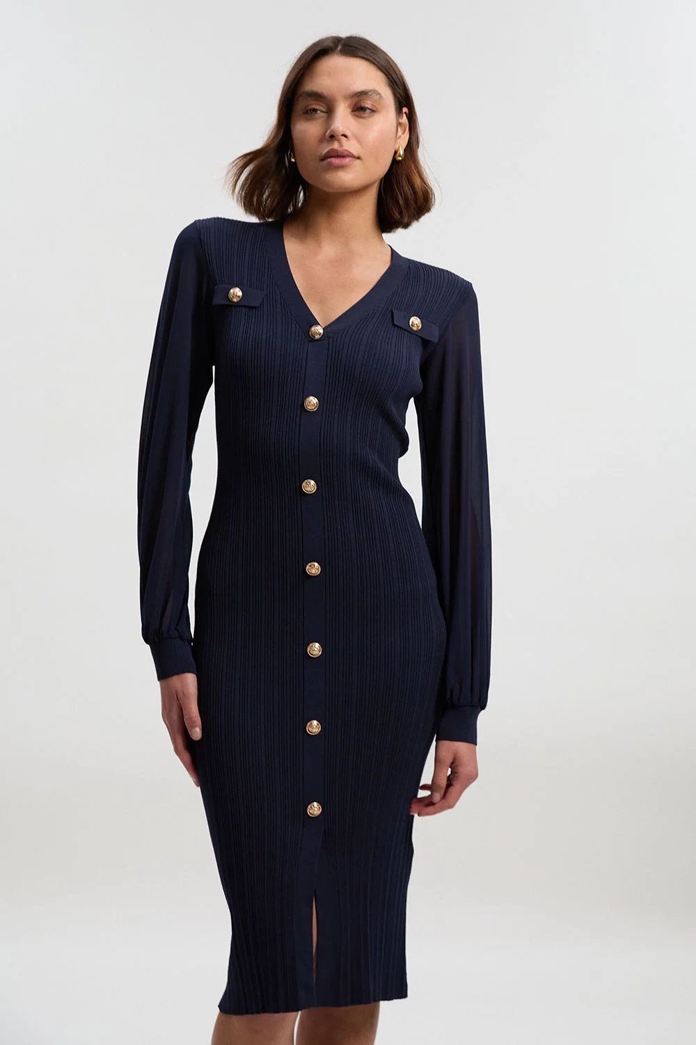 - Elegant rib knit midi dress with contrasting chiffon sleeves for a sophisticated textural mix - Button-up front design with decorative gold-tone buttons adding a refined touch - Figure-flattering silhouette with a subtle front split for ease of movement - Voluminous chiffon sleeves with fitted cuffs creating a dramatic yet wearable silhouette - Versatile midi length perfect for day-to-evening styling transitions This Karen Millen rib knit midi dress masterfully combines comfort with sophistication through its thoughtful design elements. The body-skimming ribbed texture creates a flattering silhouette while the flowing chiffon sleeves add a touch of drama to an otherwise classic piece. Style with minimal gold jewellery and ballet flats for daytime gatherings, or dress up with statement earrings and ankle boots for dinner with friends. The button-up front allows for customisable styling-wear fully fastened for a more conservative look or leave a few buttons undone for a relaxed approach. This versatile piece transitions effortlessly from family brunches to casual workplace settings, making it a cornerstone in your daywear collection. The viscose blend ensures the dress maintains its shape whilst providing comfort throughout the day. Product Details & Care 46% Viscose 30% Polyester 24% Polyamide. Wash with similar colours. Model wears UK S. CB length approx 125cm