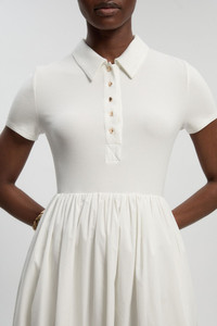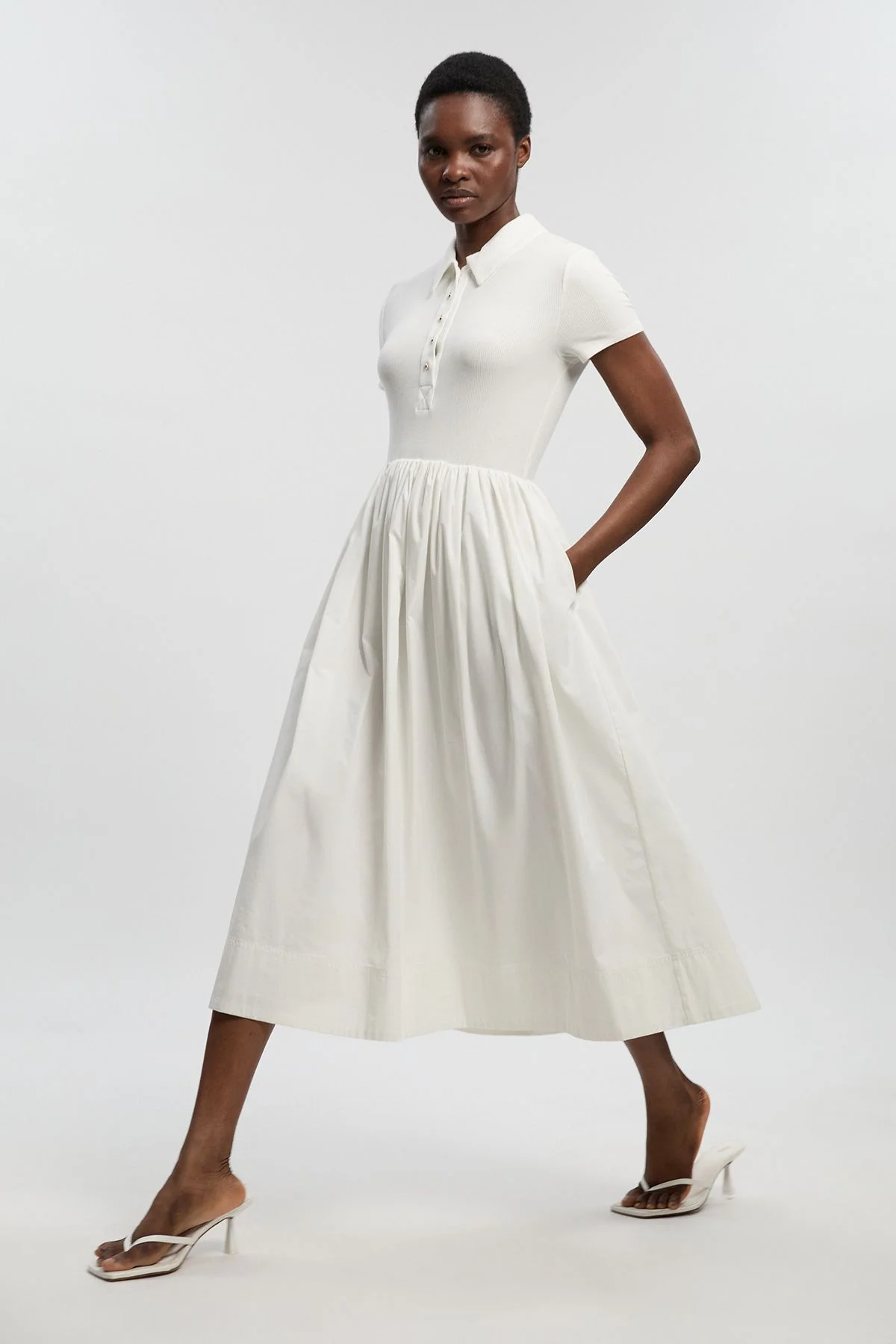 - Sophisticated collared shirt design with button-up detailing for refined elegance - Crafted from viscose rib jersey for a comfortable stretch and flattering fit - Practical side pockets discreetly integrated into the voluminous maxi skirt - Structured cotton blend collar adds a tailored touch to the feminine silhouette - Maxi length measuring approximately 120cm for dramatic yet wearable proportions This button-up collared shirt dress masterfully balances structured tailoring with fluid movement. The fitted bodice creates a defined waistline before gracefully transitioning into a sweeping maxi skirt, offering a contemporary interpretation of timeless elegance. Style with minimal mule heels as shown for daytime sophistication, or transform for evening events with statement earrings and a sleek clutch. The versatile design makes it ideal for garden parties, gallery openings or refined brunches where you wish to appear effortlessly put-together. For cooler days, layer with a cropped cardigan or tailored blazer to maintain the dress's clean lines. The ribbed jersey bodice ensures comfort throughout the day, while the maxi length creates a dramatic silhouette that commands attention without compromising on wearability. Product Details & Care Main 1: 92% Viscose/Rayon, 8% Elastane,/Spandex. Main 2: 65% Cotton, 32% Nylon, 3% Elastane/Spandex. Lining: 100% Cotton. Machine wash. Model wears UK Small. Model height: 5"9. Length approx: 120cm