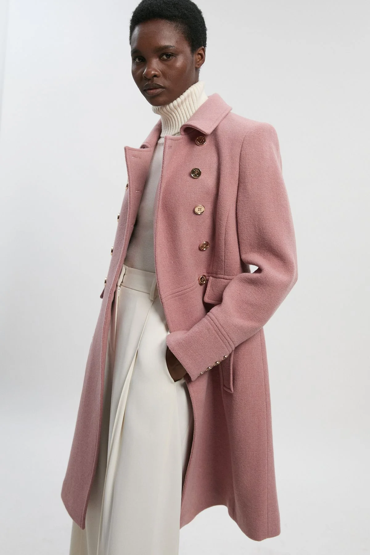 - Wool blend double-breasted coat with elegant princess silhouette - Distinctive gold-tone button detailing for a refined finish - Classic collared neckline offering timeless sophistication - Tailored fit with structured shoulders and defined waistline - Mid-length design (93cm) perfect for versatile seasonal styling This Karen Millen tailored princess coat manifests refined craftsmanship with its structured silhouette and double-breasted button front. The wool blend fabric provides warmth without compromising on style, making it an essential addition to your autumn-winter wardrobe. Style as shown with a cosy roll neck jumper and wide-leg trousers for an effortlessly chic daytime ensemble. The coat transitions beautifully from weekend brunches to family gatherings, offering a polished finish to casual outfits. For everyday elegance, pair with straight-leg jeans, ankle boots and a crossbody bag. The versatile design works wonderfully with both tailored separates and more relaxed pieces, making it a true wardrobe cornerstone that reflects the sophisticated yet contemporary aesthetic that defines the Karen Millen woman. Product Details & Care Main: 64% Wool, 36% Polyester. Lining: 55% Polyester, 45% Viscose/Rayon. Model wears UK8 / US4. Model height: 5"9. Approx length: 93cm