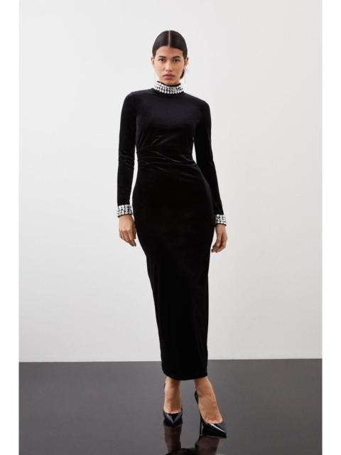 Stretch Velvet Crystal Embellished Long Sleeve Maxi Dress