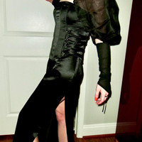 Vintage Jessica McClintock Satin Corset Gown – High Slit Black Evening Dress | S Step into old Hollywood glamour with this rare vintage Jessica McClintock for Gunne Sax evening gown. A dramatic corseted silhouette meets luxurious black satin, accented with a sultry thigh-high slit. The structured bodice features hook-and-eye details reminiscent of classic corsetry, creating a striking, hourglass fit. A true bombshell piece, this gown is both timeless and evocative — made for moonlit galas, elegant parties, or your next editorial moment. Details: • Size: 3/4 (best fits XS/S) • Material: 100% polyester shell and lining • Features: Corset boning, structured fit, thigh slit, zip back • Era: Likely late 90s to early 2000s • Bolero not included – shown for styling inspiration only Styling tip: Pair with pointed heels and sculptural jewelry for a complete femme fatale look.