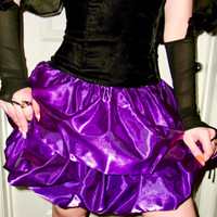 Vintage 80s Jessica McClintock for Gunne Sax Strapless Bubble Mini Dress Channel your inner 80s It Girl in this incredible vintage Jessica McClintock for Gunne Sax strapless party dress, featuring a bold purple bubble skirt and sleek velvet bodice. A total Molly Ringwald meets Morticia Addams moment. Features: • Structured black velvet bodice with light boning for shape and support • Double-layered bubble skirt in metallic purple taffeta — fully lined for volume and drama • Back zip closure with hook and eye • Tagged a vintage size 7/8 (best for modern extra Small / 0-2) • Made in the USA Note: The sheer black bolero seen in photos is not included — shown for styling inspiration only.