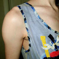 Vintage Karl Lagerfeld eponymous brand mid-80s black silk and light blue mini tank cocktail dress with beautiful symmetric beading on top. colors are vibrant. No fading. No snagging of fabric or pulling of seams anywhere. This dress is in amazing condition especially for its age (40 years old). Size 36 / US 2. fits like XS/S.