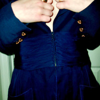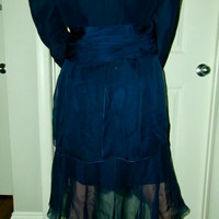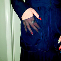 vintage Karl lagerfeld Spring 1993 silk skirt suit set. super adorable. Navy blue and the skirt is fully a skirt but the blazer is like only a cropped blazer and the rest is silk chiffon i think like you can see the pockets are like not wool lol and it zips up it’s sweet. fits XS-S. Def ask for measurements if it’s for wearing and not just museuming.