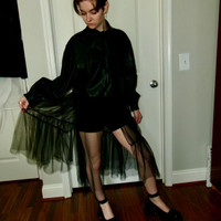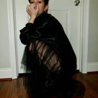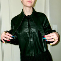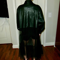 LOVE THIS faux leather kate hewko long sleeve / balloon sleeve shirt / sheer overlay dress situation ? worn here with shorts under but can do whatever you want, bodysuit, biker shorts, spandex, etc. long exaggerated collar is so fun and this is just such a fun androgynous piece to layer over other things.