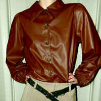 brown faux leather button up shirt with pointed collar and balloon sleeves she’s a gregory’s chocolate brown and buttery soft i just don’t wear her enough!