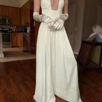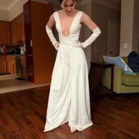 This show-stopping, never-worn bridal jumpsuit from Rara Avis Group is a DREAM Crafted from ivory fabric with a wide-leg palazzo silhouette, this jumpsuit delivers the elegance of a gown with the comfort and edge of tailored design. A deep V neckline is softened by illusion mesh, while pleating at the waist adds flow and movement. ✨ Designer: Rara Avis Group (luxury label) ✨ Condition: Never worn ✨ Details: • Sleeveless bodice and bra padding • Sheer mesh insert across plunging V neckline • Fully lined • Flowing palazzo-style legs with elegant pleats • Long inseam – ideal for tall frames or tailoring This piece makes an unforgettable statement for weddings, receptions, elopements, or editorial photoshoots. Would also suit eveningwear, red carpet, or fashion events. 🧵 Original retail: Over $1,200 📦 Will be shipped carefully packaged with tracking + insurance ⸻ #raravisgroup #bridaljumpsuit #palazzojumpsuit #weddingoutfit #nontraditionalbride