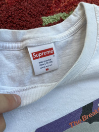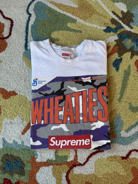 Supreme Wheaties Tee Shirt SS21 White Released in black & white only Gently used -no holes -no major flaws -light graphic fade 100% Authentic Ships next day *Can ship worldwide, dm with your location Thank you for looking at my listing! I sell many items including brands like Supreme , FTP , Palace , and Bape Items are sold as pictured and are authentic. Streetwear , designer , vintage . You can find it all on my page.