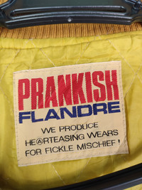 Description PLEASE READ BEFORE BUY!! BUY WITH CONFIDENT!! Prankish Flandre Vintage Varsity Jacket MEASUREMENTS (WHEN LAID FLAT): (Please check the actual measurements below) Armpit to armpit : 23 Inches (recommended M) Length from top to bottom : 24.5 inches Sleeve length from under armpit to end of cuff : -16.5 Condition : 8/10 Good Condition Defect : none WE GUARANTEE SATISFACTION & AUTHENTICITY! NOTHING TO WORRY AND THANK YOU! Payment method : Paypal Shipping Item will be shipped in 1-3 working days after payment received. Shipping takes 10-14 business days to most countries. All items will be post by registered mail/parcel with record tracking numbers. Note : An Item That Has Been Used Or Worn Previously. No return after payment made. Please Leave Your Phone Number On The Note While Make A Purchase. Dont Forget To Check Out My Store For More Great Stuff Thank For Visited.