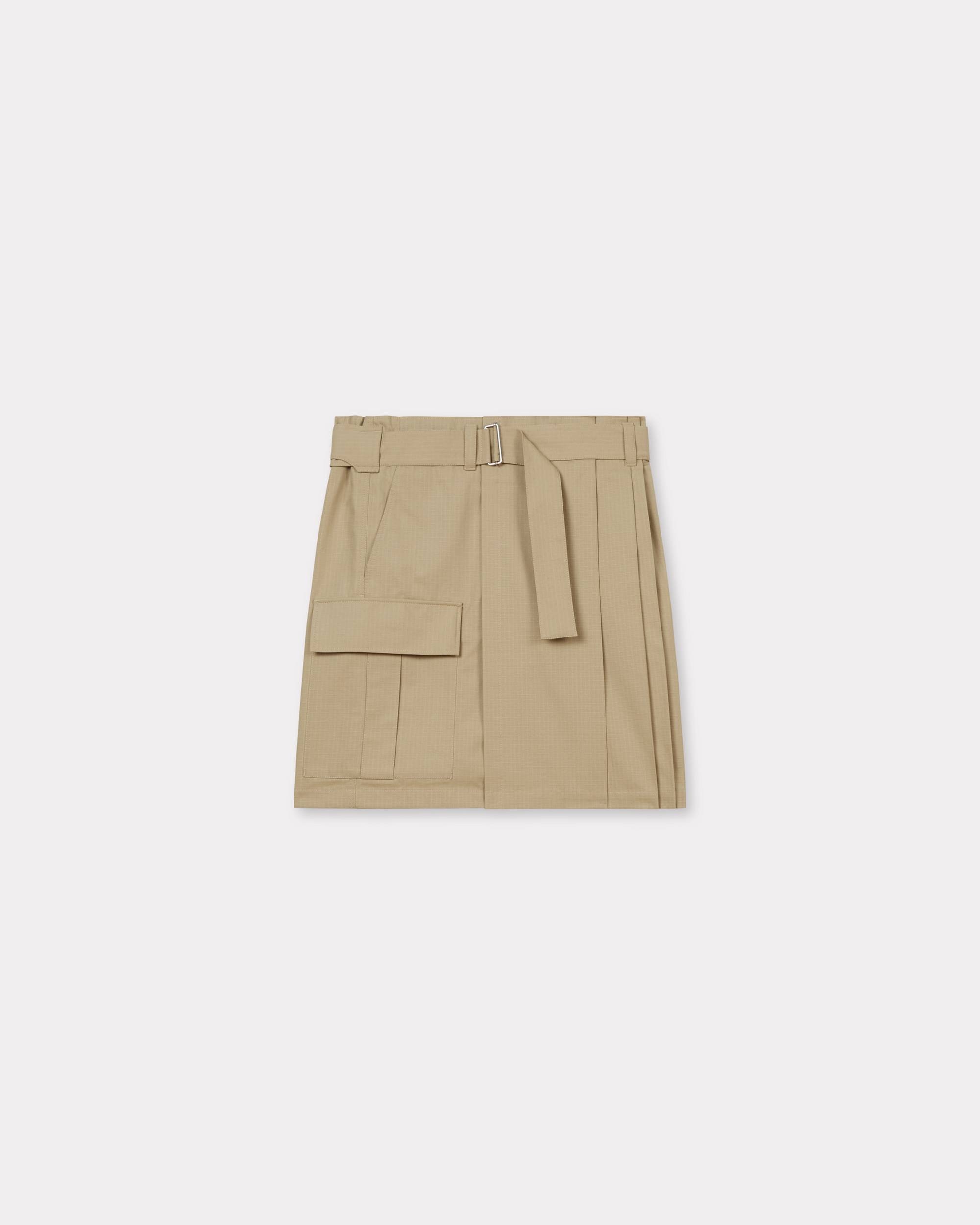Cargo knee skirt. Cotton ripstop. 2 seam pockets. 2 patch pocket at side with flap and large pleats at front. Elasticated band at back and belt to adjust the waist. Bicolor 'KENZO Paris' label at side pocket. Product Reference: FF52JU2989DL.11 SIZE & FIT The model is 175 cm tall and is wearing size S. Back length at 60 cm. COMPOSITION & CARE Made in Bulgaria 100% cotton Do not bleach Mild professional dry-cleaning in: hydrocarbons Iron at low temperature Line drying in the shade Do not tumble dry 30°C very mild fine wash Very mild professional wet-cleaning