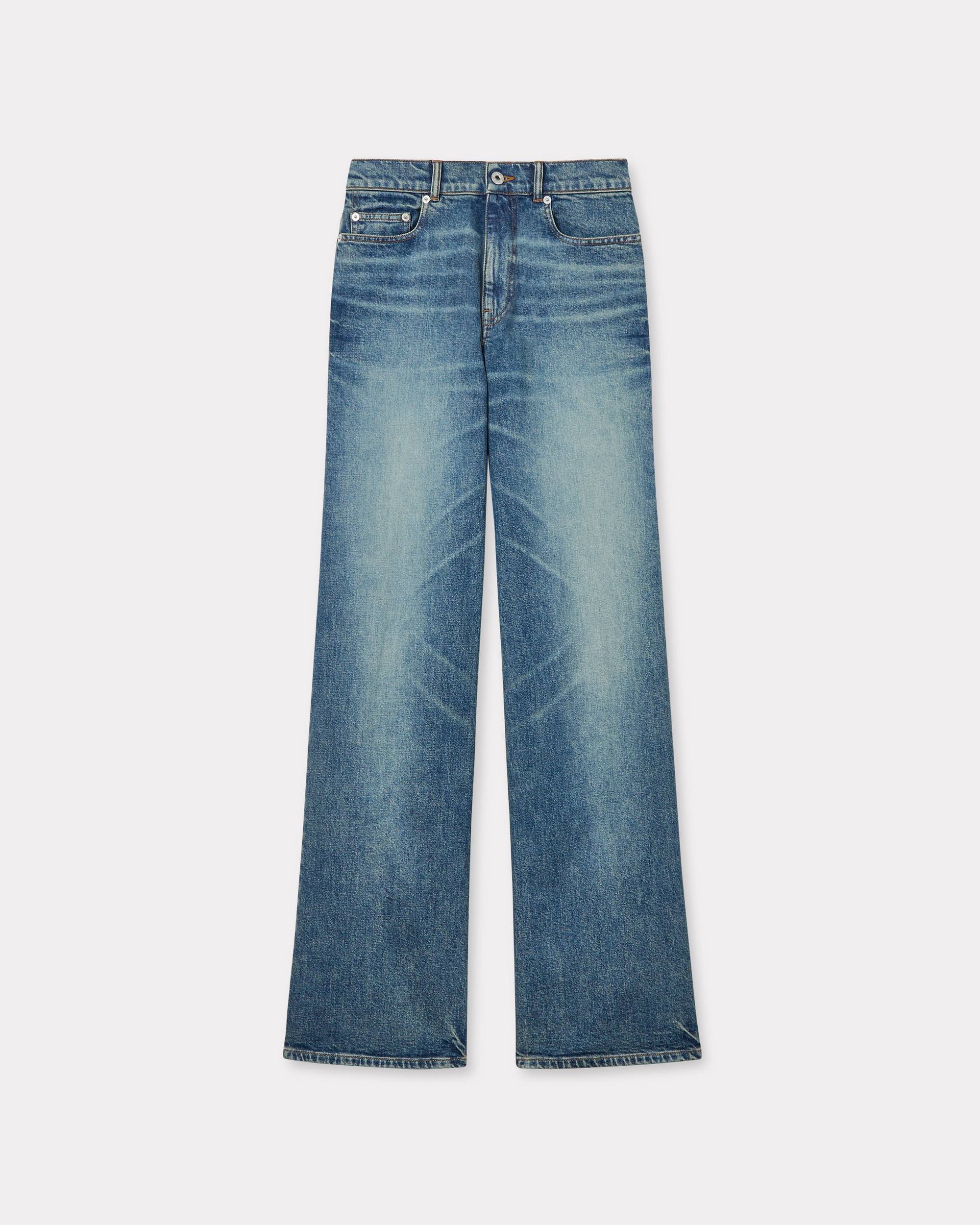 AYAME wide jeans in japanese denim. Stretch japanese denim. Stone wash. Contrasted topstitches. 'KENZO Paris' leather jacron at back. Engraved buttons and Mont Fuji topstitches at back pockets. Product Reference: FF52DP2176S7.DS SIZE & FIT The model is 175 cm tall and is wearing size S. Leg length at 113 cm. COMPOSITION & CARE Made in Portugal 98% cotton, 2% elastane Do not bleach Mild professional dry-cleaning in: hydrocarbons Iron at low temperature Line drying in the shade Do not tumble dry 30°C very mild fine wash Very mild professional wet-cleaning
