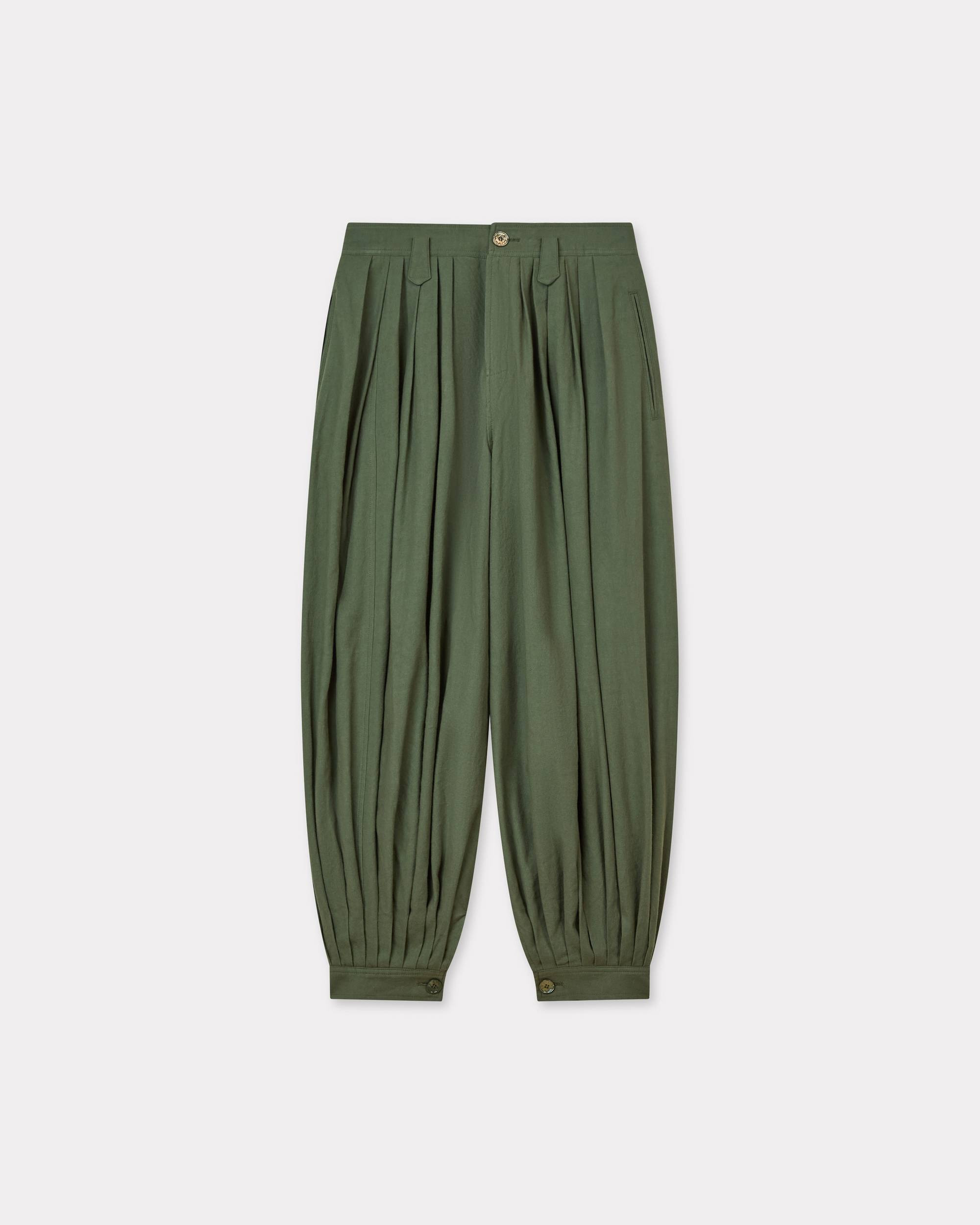 Balloon pants in cotton. Pleats at front, back and bottom. V-cut at back and belt loops. Button & zip closure at front. Pink heart inside the fly flap. Button at the bottom leg. Mother-of-pearl button engraved 'KENZO Paris'. KENZO Archive tonal signature at bottom leg. Product Reference: FF62PA1179BE.51 SIZE & FIT The model is 175 cm tall and is wearing size S. Oversize fit. Low-waist. The fit of this product is oversized. For a more fitted look, we recommend choosing one size smaller than your usual size. COMPOSITION & CARE Made in Romania 56% cotton, 44% hemp Do not bleach Mild professional dry-cleaning in: hydrocarbons Iron at low temperature Line drying in the shade Do not tumble dry 30°C very mild fine wash Very mild professional wet-cleaning