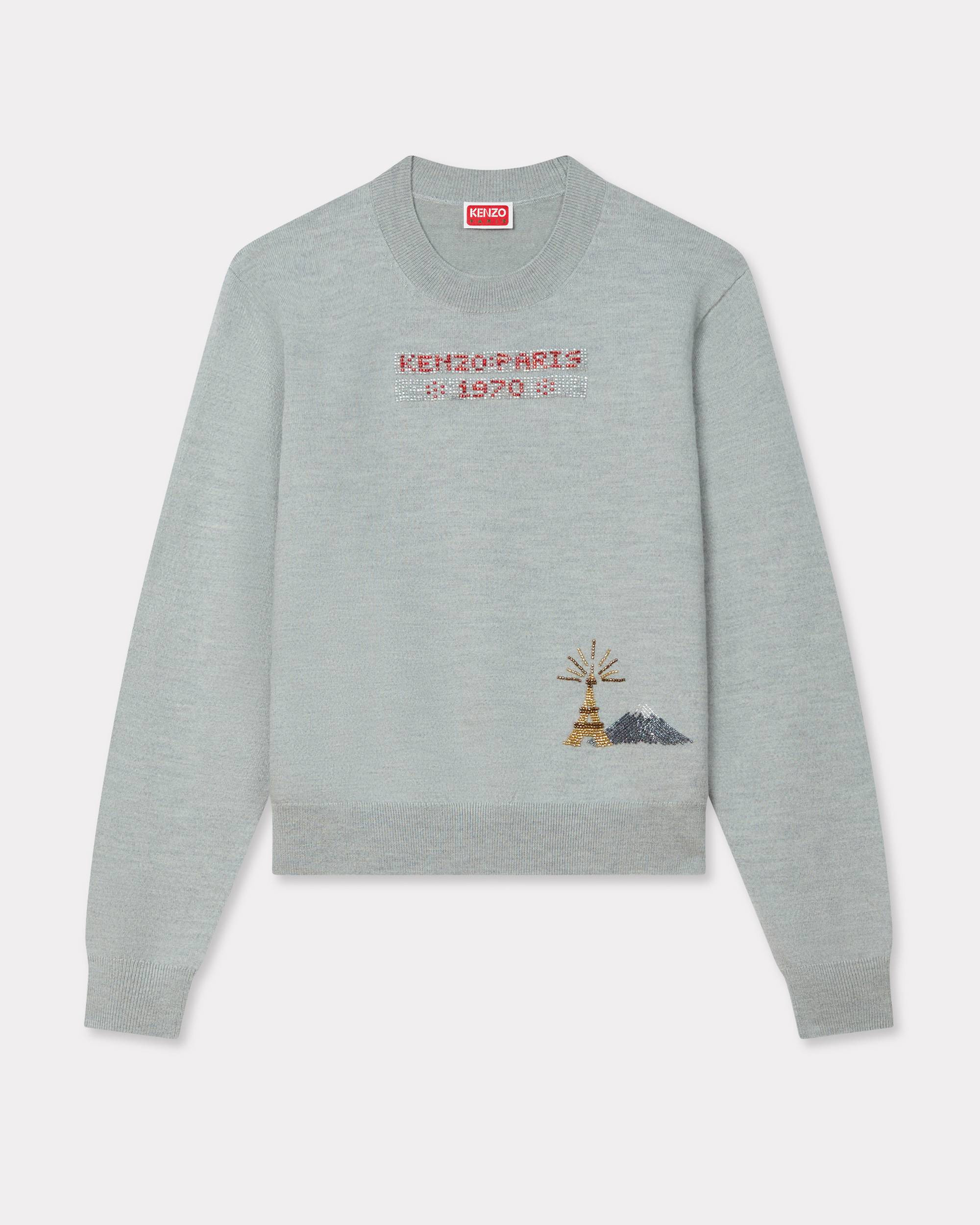 Beaded trimps jumper. Light Wool. ‘KENZO Paris’ branding in pearls as a front placed artwork. Pearls embroideries representing the Eiffel Tower and the Mount Fuji. Product Reference: FF62PU7263CU.94 SIZE & FIT The model is 175 cm tall and is wearing size S. COMPOSITION & CARE Made in China 88% wool, 11% polyamide, 1% elastane Do not bleach Mild professional dry-cleaning in: hydrocarbons Flat drying in the shade Do not tumble dry Hand wash
