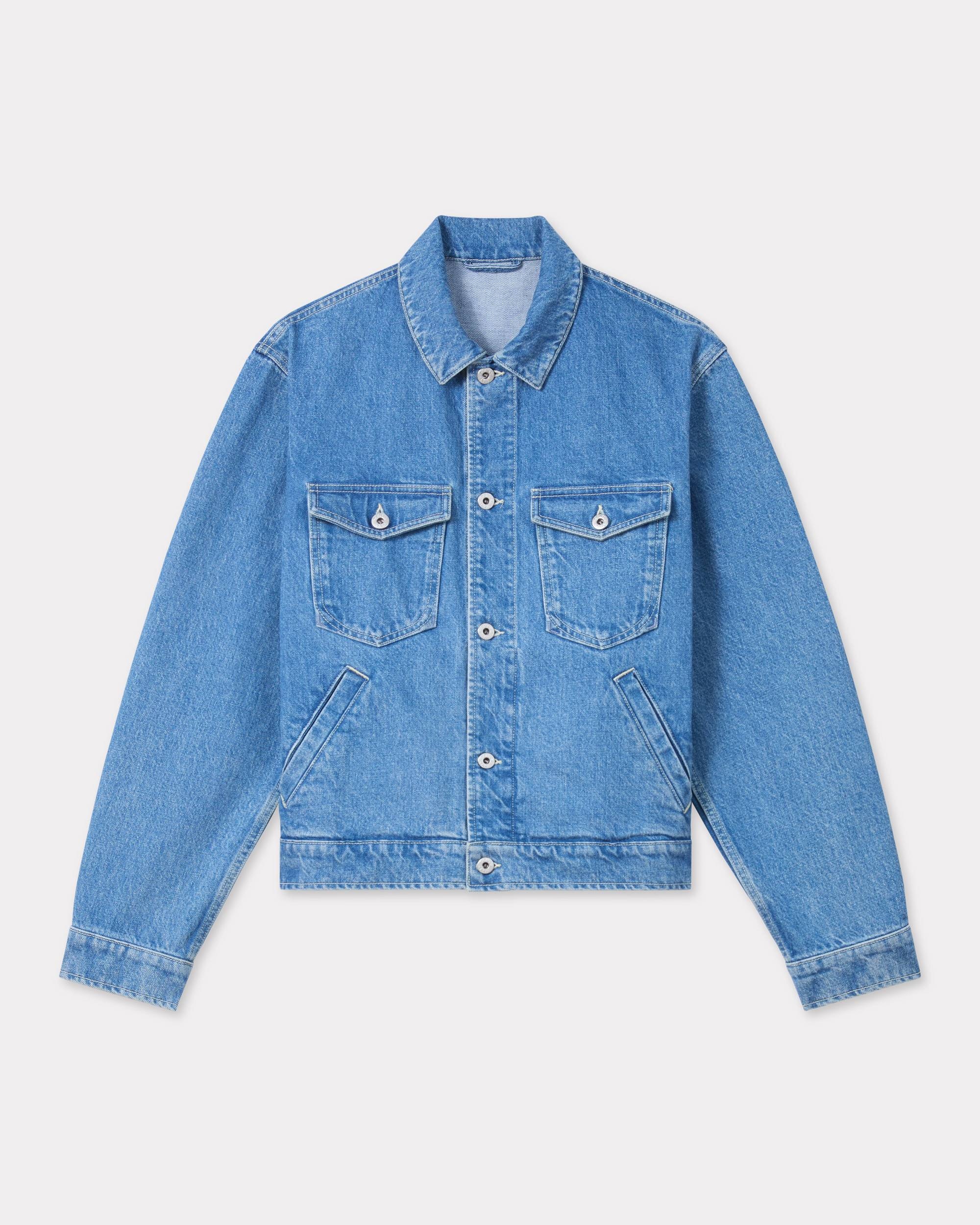 'Boke Flower' trucker denim jacket. Stone bleached wash. Boke Flower and KENZO Paris embroideries on the back. Kaihara Japanese denim. Buttoned waist tabs. Two chest pockets. Two side pockets. Product Reference: FE65DV3016A4.DT SIZE & FIT Cropped boxy fit. Back length at 62 cm. The model is 185 cm tall and is wearing size M. COMPOSITION & CARE Made in Tunisia 100% cotton Do not bleach Mild professional dry-cleaning in: hydrocarbons Iron at low temperature Line drying in the shade Do not tumble dry 30°C very mild fine wash Very mild professional wet-cleaning