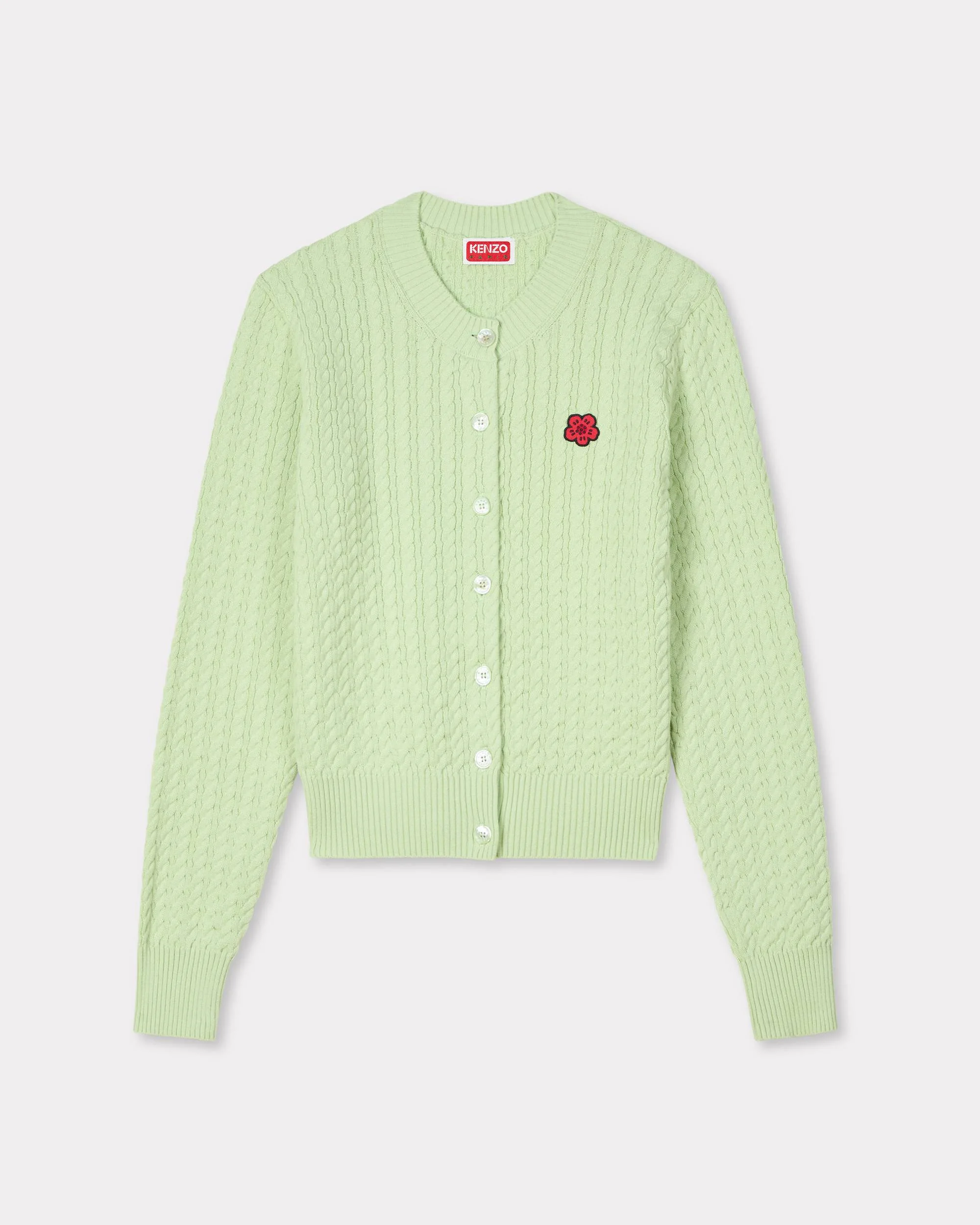 'Boke Flower' knit cardigan. Cotton Wool cable knit. Buttoned crewneck cardigan. ‘Boke Flower’ badge embroidered on the chest. Product Reference: FG52CA7273LK.47 SIZE & FIT The model is 175 cm tall and is wearing size S. Regular fit. This item fits true to size. Take your usual size. COMPOSITION & CARE Made in Bulgaria 85% cotton, 15% wool Do not bleach Mild professional dry-cleaning in: hydrocarbons Do not iron Flat drying in the shade Do not tumble dry 30°C very mild fine wash Very mild professional wet-cleaning