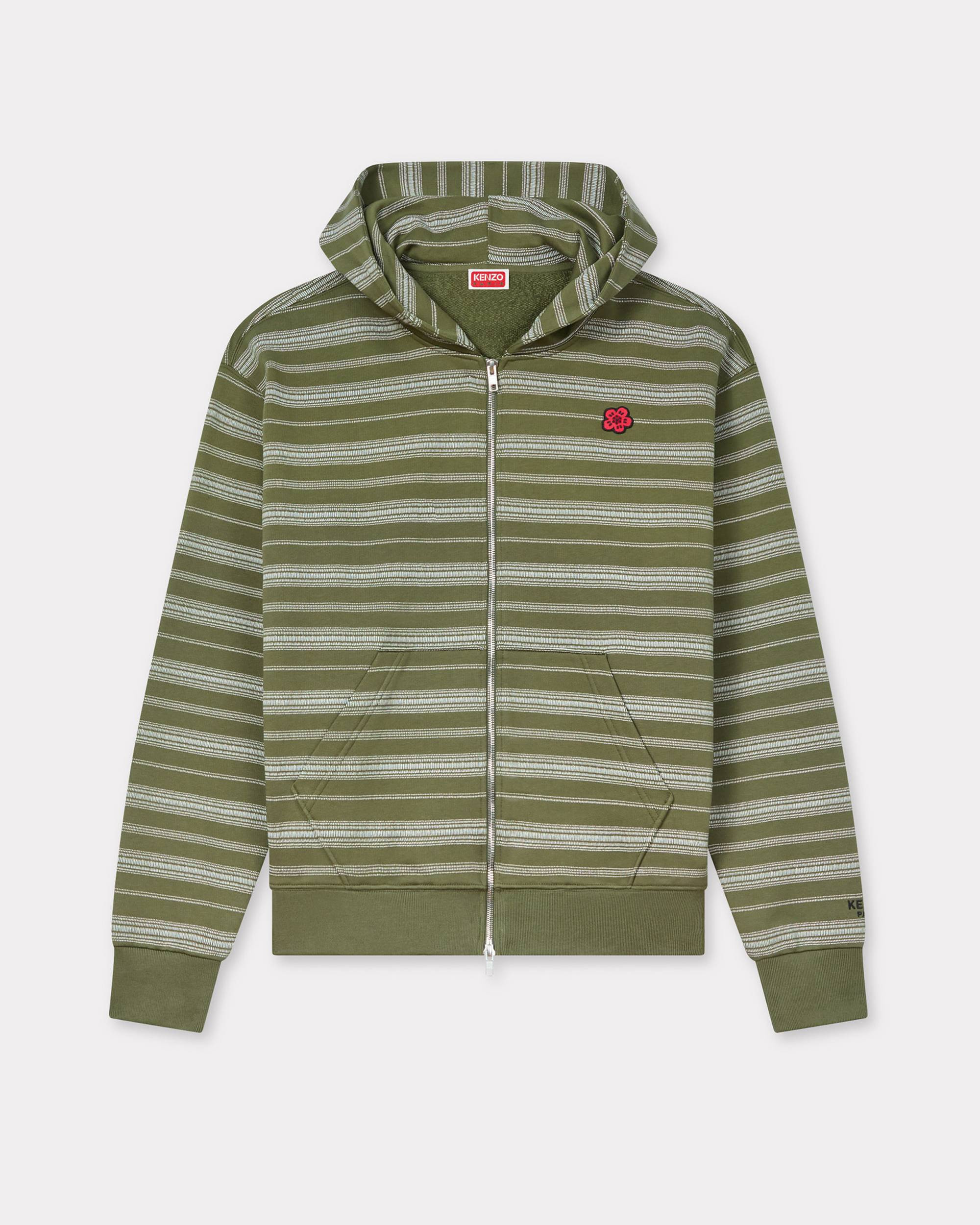 'Boke Flower' stripped embroidered full zip hoodie. Printed striped molleton. Two-way zip. Ribbed cuffs and hem. Kangaroo pocket. ‘Boke Flower’ logo as small crest embroidered and ‘KENZO Paris’ logo on the sleeve. Product Reference: FF65HO2524MS.50 SIZE & FIT The male model is 185 cm tall and is wearing size M. Classic fit. COMPOSITION & CARE Made in Portugal 100% cotton Do not bleach Iron at low temperature Do not tumble dry