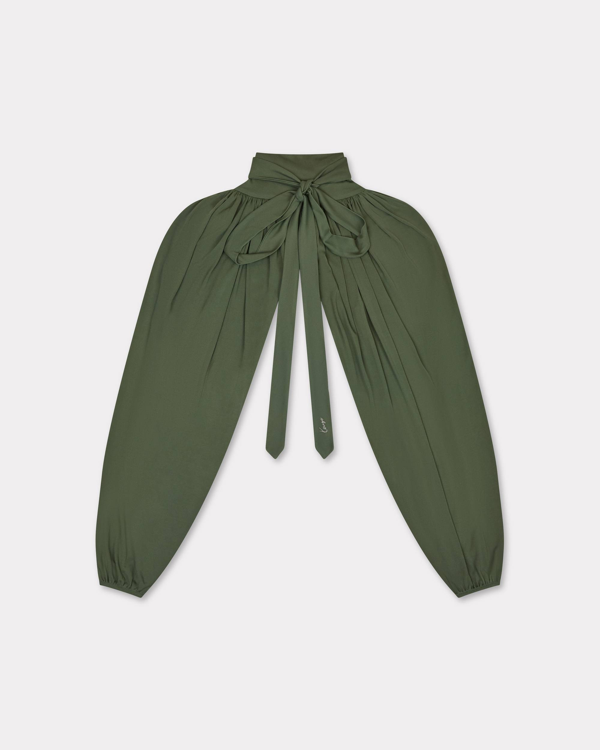 Draped top with balloon sleeves. Viscose silk luxury jersey. Open front and back with a bow tie at collar. Elastic at cuffs. Bow tie as a closure around the neck. 'KENZO Archive' embroidery on the tie. Product Reference: FF62TO2369AD.51 SIZE & FIT The model is 175 cm tall and is wearing size S. COMPOSITION & CARE Made in Madagascar 83% viscose, 17% silk Do not bleach Mild professional dry-cleaning in: hydrocarbons Iron at low temperature Do not wash