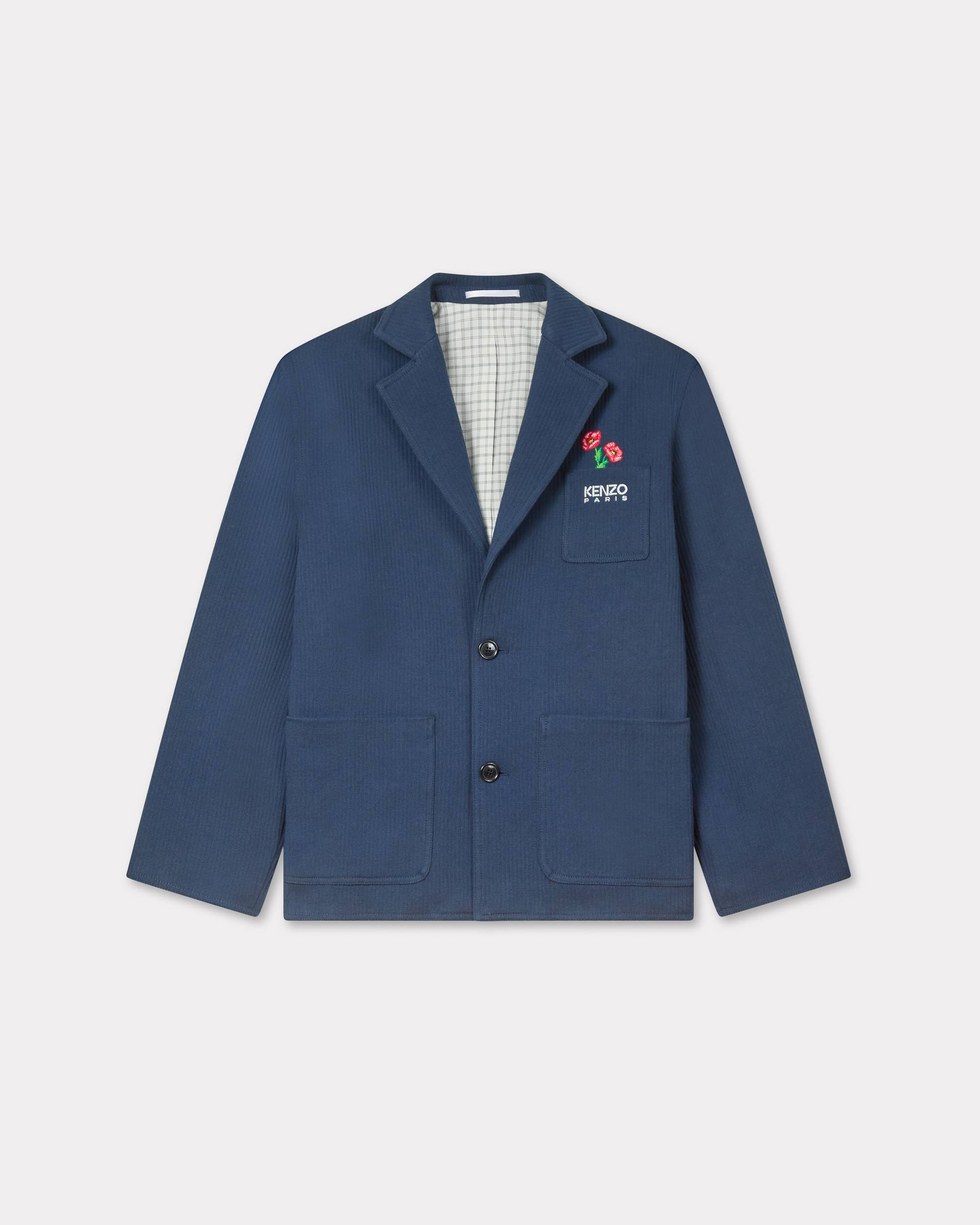 This retro workwear jacket in ribbed fabric is embellished with a 'Kenzo Paris' logo in satin stitch embroidery on the front. Inspired by the fashion house's archive designs, this motif is a heartfelt tribute to Kenzo Takada's love of flowers. 'KENZO Archive Bouquet' embroidered workwear jacket. Ribbed fabric and checks navy lining. Notched collar, cuff button, two patch pockets and single-breasted closure. One inside pocket with button closure. KENZO front embroidery. Product Reference: FF62VE2759OU.77 SIZE & FIT The model is 175 cm tall and is wearing size S. Back length at 70cm. Boxy cropped fit. COMPOSITION & CARE Made in Romania 100% cotton Iron at low temperature Do not wet-clean