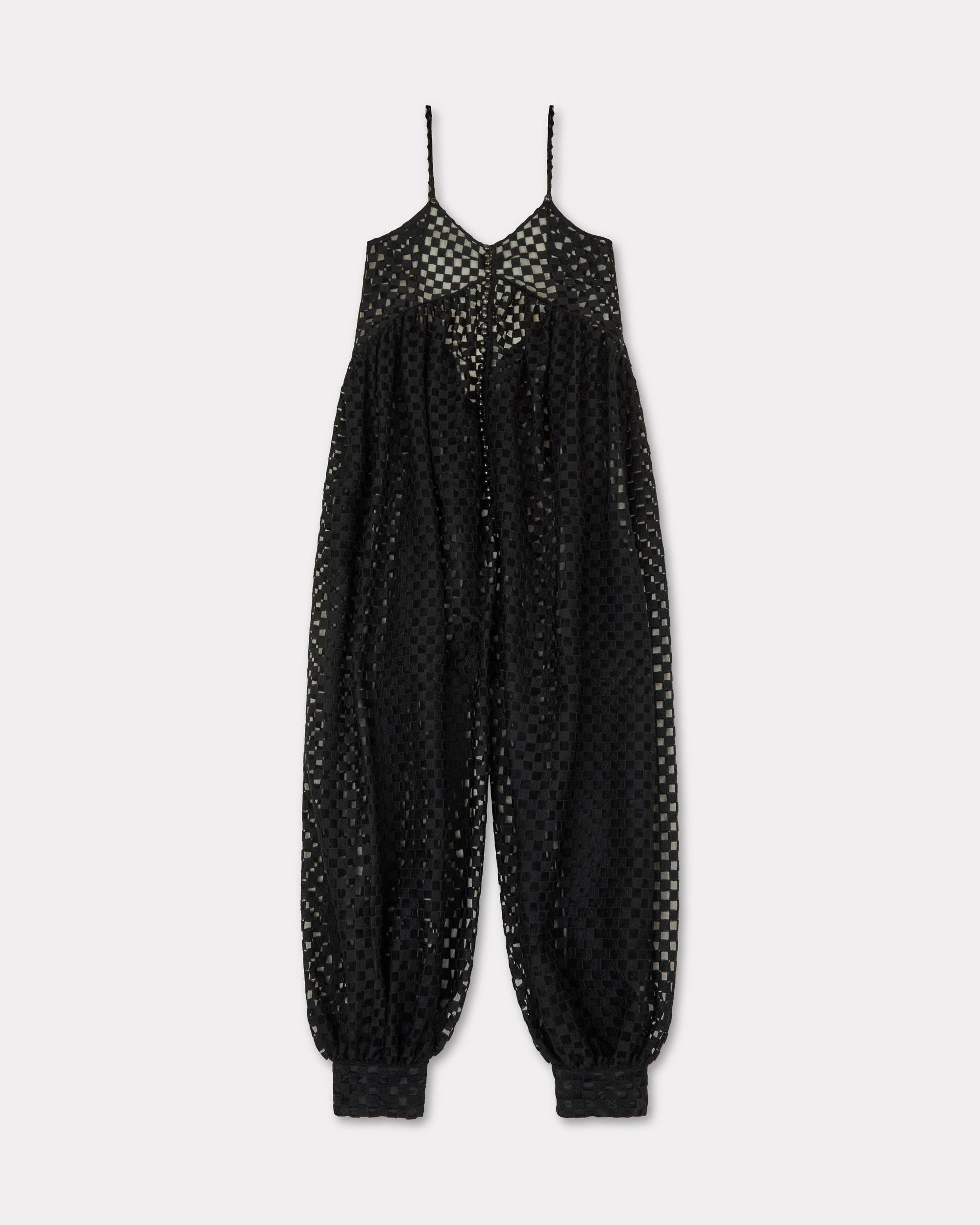 'KENZO Damier' jumpsuit. Backless. Balloon leg. Non lined product so transparent. Mother-of-pearl buttons at front neck and at bottom legs. Adjustable straps at back. KENZO Archive embroidery at bottom leg. Product Reference: FF62CO5529AC.99 SIZE & FIT The model is 175 cm tall and is wearing size S. COMPOSITION & CARE Made in Madagascar 80% polyester, 20% polyamide Do not bleach Mild professional dry-cleaning in: hydrocarbons Iron at low temperature Flat drying in the shade Do not tumble dry Hand wash Very mild professional wet-cleaning