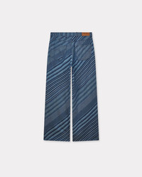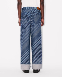 'KENZO Diagonal Stripe' turn up wide fit jeans. Herringbone bias rinse denim. Kaihara Japanese denim. One front ticket pocket. Two side pockets. Two back pockets. 'KENZO Paris' leather jacron on the back, 'KENZO Paris' button and the Mount Fuji. Printed. Product Reference: FF65DP4216Z1.DM SIZE & FIT The male model is 185 cm tall and is wearing size M. Leg length at 118cm, hem recommended length is 11cm. Relax fit. COMPOSITION & CARE Made in Tunisia 100% cotton Iron at low temperature Do not tumble dry Very mild professional wet-cleaning