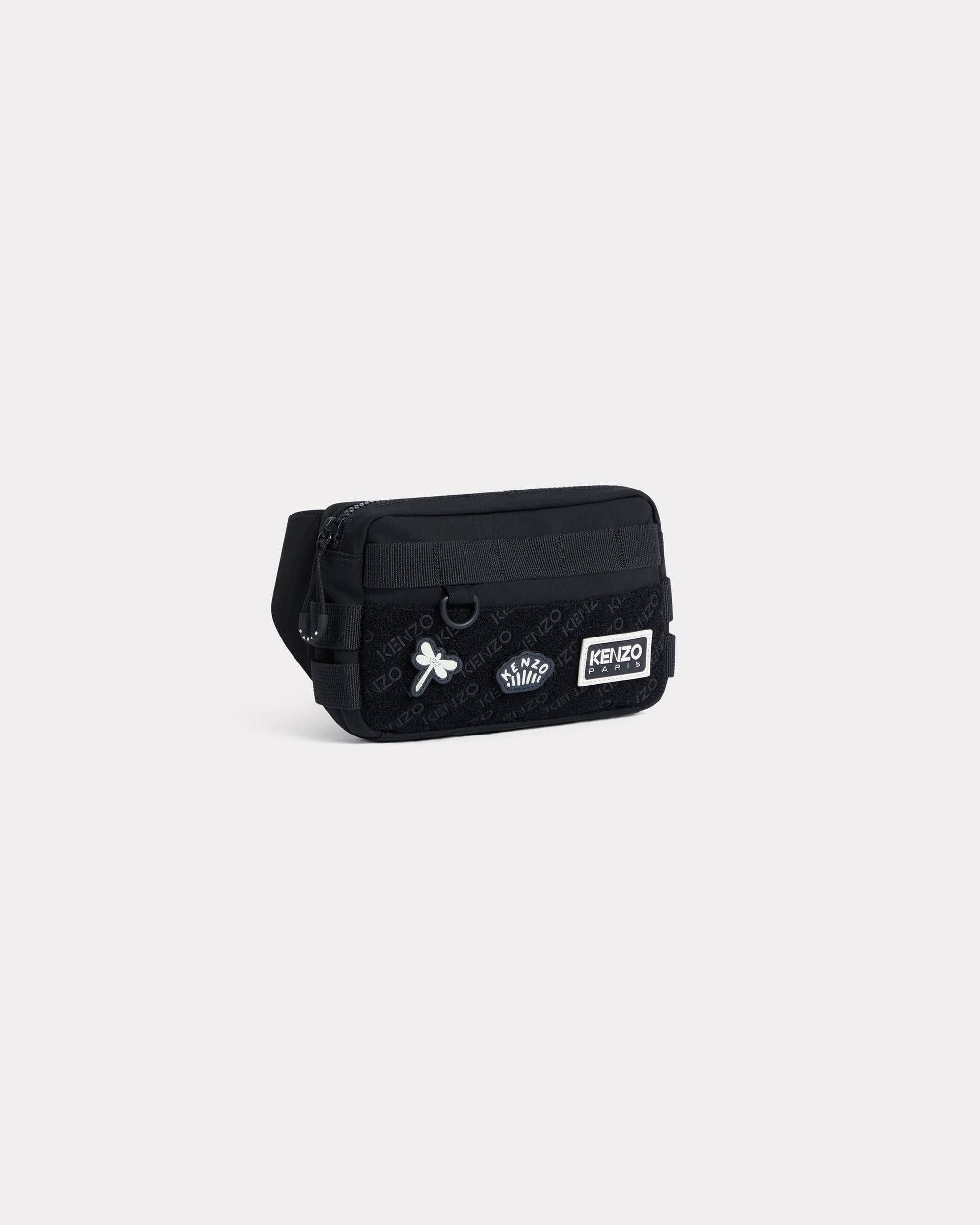 'KENZO Jungle' belt bag in nylon. Adjustable belt. Zip fastener. 1 zipped compartment. 1 inside flat pocket. 1 inside card case. 1 outside zipped pocket. 2 belt loops with press studs. 3 badges. Matt Black PVD. Detachable badges including 'KENZO Paris' logo. Monogram on the velcro part. Branded zip pullers. Monogram jacquard lining. Carried as a belt bag. Carried as a crossbody bag. Product Reference: FF55SA217F20.99.TU SIZE & FIT Dimensions : 21,5 x 13 x 4,5 cm. Waist size : max 140 cm. COMPOSITION & CARE Made in China 69% polyester, 31% nylon Do not bleach Do not dry-clean Do not iron Do not dry Do not tumble dry Do not wash Do not wet-clean