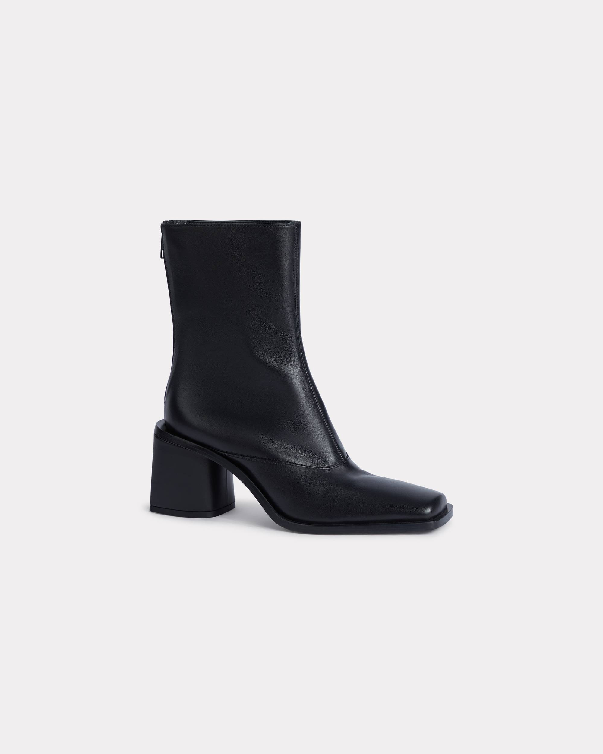KENZO Kimi' ankle boots. Calf leather. Calf leather lining. Tonal sole in leather with abs heel. Tonal black welt. KENZO silver letters on the back of the heel. Product Reference: FF62BT120L66.99 SIZE & FIT Sole: 7.5 cm. COMPOSITION & CARE Made in Italy 100% calf leather