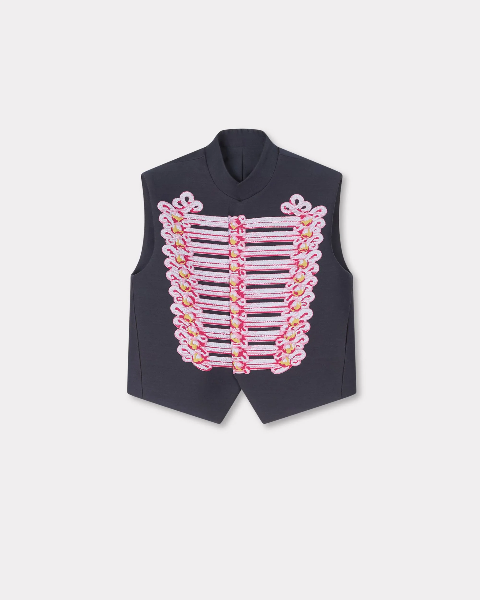Presented at the Spring/Summer 2026 show, this trompe-l'œil jacket was inspired by a knitted piece from the Autumn/Winter 1972 collection. With a Mao collar and concealed single fastening, it is made from a cool wool and cotton blend. It features a contrasting military-inspired Brandenburg jacquard on the front. 'KENZO Trompe L'œil' vest. Mixed wool cotton. Contrasted jacquard Brandenburg at front. Closure at front with hooks. Inside jetted pocket. Officer collar and hidden single closure. Product Reference: FG52GI0129JG.76 SIZE & FIT The model is 175 cm tall and is wearing size 36. Back length 45 cm. This item is designed for a slim fit. Take your usual size. COMPOSITION & CARE Made in Portugal 90% virgin wool, 6% silk, 4% polyamide Do not bleach Mild professional dry-cleaning in: hydrocarbons Iron at low temperature Line drying in the shade Do not tumble dry Do not wash Do not wet-clean