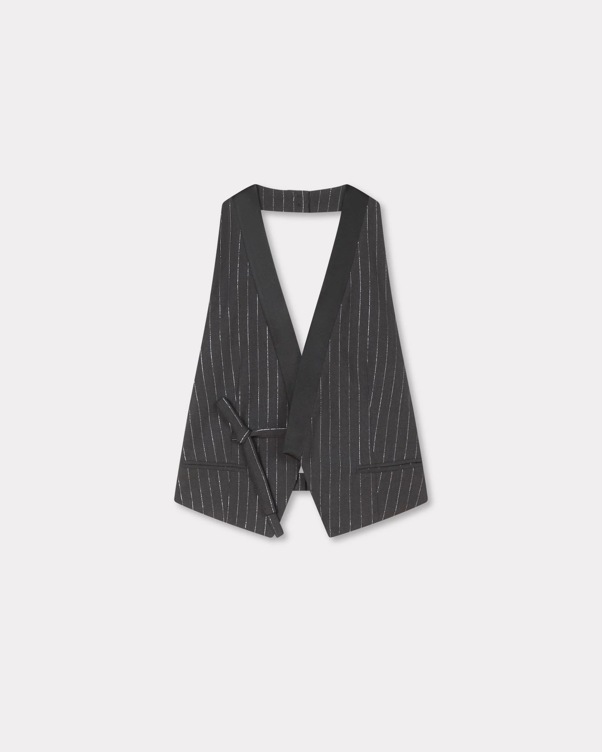 Inspired by the Maison's Japanese heritage, this sleeveless halter-style kimono jacket gives the traditional garment a contemporary twist. Made from lurex-striped wool with a satin collar, it stands out thanks to an elegant bow fastening at the front. This piece can be worn on its own or paired with the matching trousers. 'KENZO Winter Holidays' backless vest. Wool blend and velvet collar. Strap kimono closure and inside button to keep the kimono shape. Two jetted fake pockets at front. Possibility to adjust the waist and the neck thanks to buttons. Lurex red label inside. Product Reference: FG52GI0139RB.98 SIZE & FIT The model is 175 cm tall and is wearing size 36. COMPOSITION & CARE Made in Romania 75% virgin wool, 23% polyamide, 2% elastane Do not bleach Mild professional dry-cleaning in: hydrocarbons Iron at low temperature Line drying in the shade Do not tumble dry Do not wash Do not wet-clean
