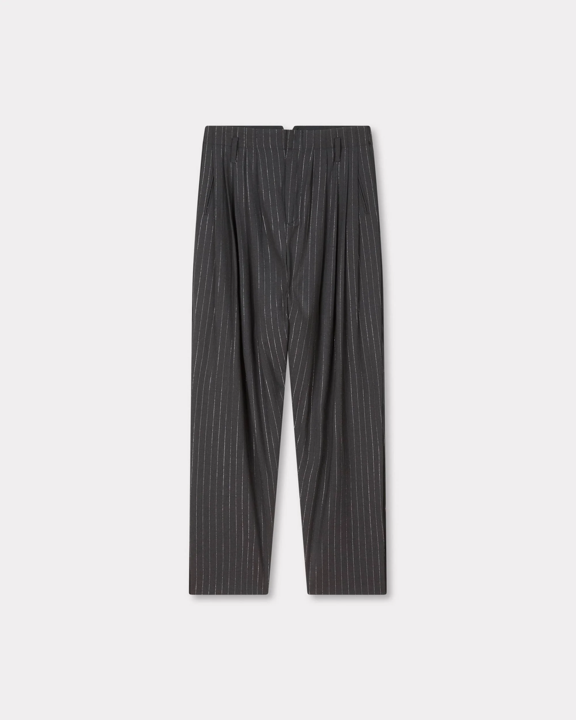 Crafted from lurex-striped wool and trimmed with a satin band on the sides, these low-rise tailored trousers are inspired by dinner jackets. Pleats at the front, back, and bottom of the legs add structure to the silhouette. These trousers have a V cutout at the back and belt loops. 'KENZO Winter Holidays' pleated pants. Pleats at front and back. V-cut at back and belt loops. Piping at side. Button & zip closure at front. Two jetted pockets at back. Lurex red label inside. Product Reference: FG52PA1169RB.98 SIZE & FIT The model is 175 cm tall and is wearing size 36. Regular shape. COMPOSITION & CARE Made in Romania 75% virgin wool, 23% polyamide, 2% elastane Do not bleach Mild professional dry-cleaning in: hydrocarbons Iron at low temperature Line drying in the shade Do not tumble dry Do not wash Do not wet-clean