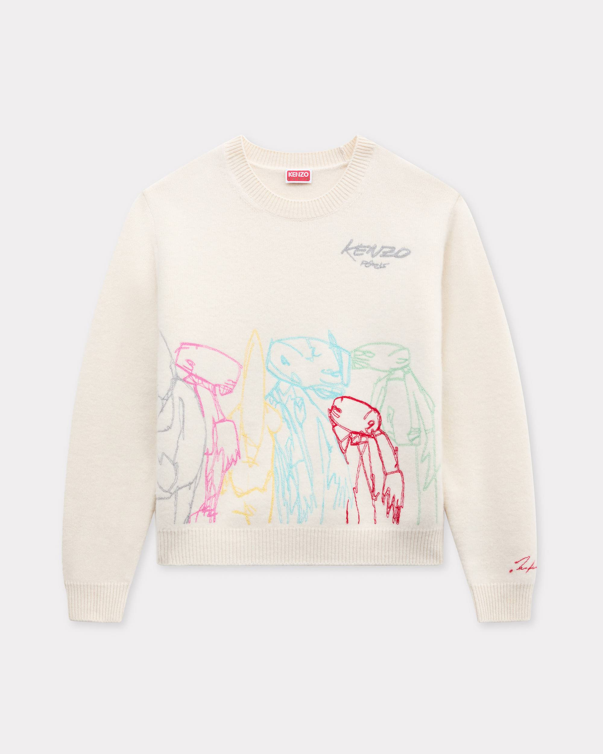 This wool jumper has an embroidered trim and celebrates the unique collaboration between Kenzo and Futura 2000. In true Kenzo style, it has a brightly-coloured version of Pointman, the artist's famous character. The piece is trimmed with a graffiti-style embroidered 'Kenzo Paris' on the chest, redesigned by the artist. 'Kenzo x Futura 2000' jumper. Wool. Embroidered branding at chest. Product Reference: FF62PU7333BP.02 SIZE & FIT The model is 175 cm tall and is wearing size S. COMPOSITION & CARE Made in China 100% wool Do not bleach Do not dry-clean Iron at low temperature Flat drying in the shade Do not tumble dry 30°C very mild fine wash Very mild professional wet-cleaning