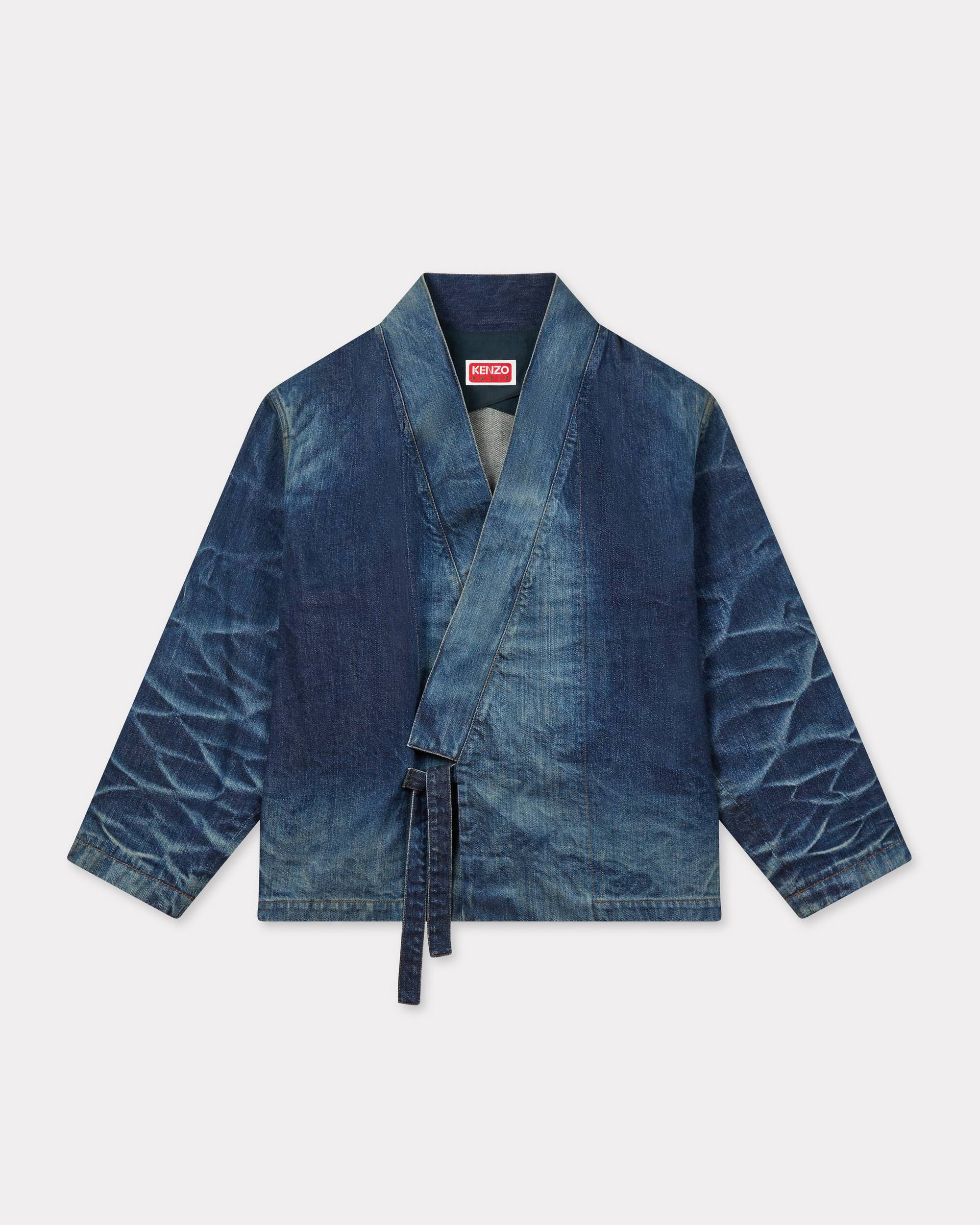 Kimono jacket. Stone bleach dirty denim. Kuroki Japanese denim. Half lined. KENZO Paris leather jacron on the back neck. Each piece will have different effects and will be unique. Product Reference: FF65DV1466I7.DY SIZE & FIT The male model is 185 cm tall and is wearing size M. Back length at 63,7 cm. Kimono fit. COMPOSITION & CARE Made in Portugal 100% cotton Iron at low temperature Do not wash