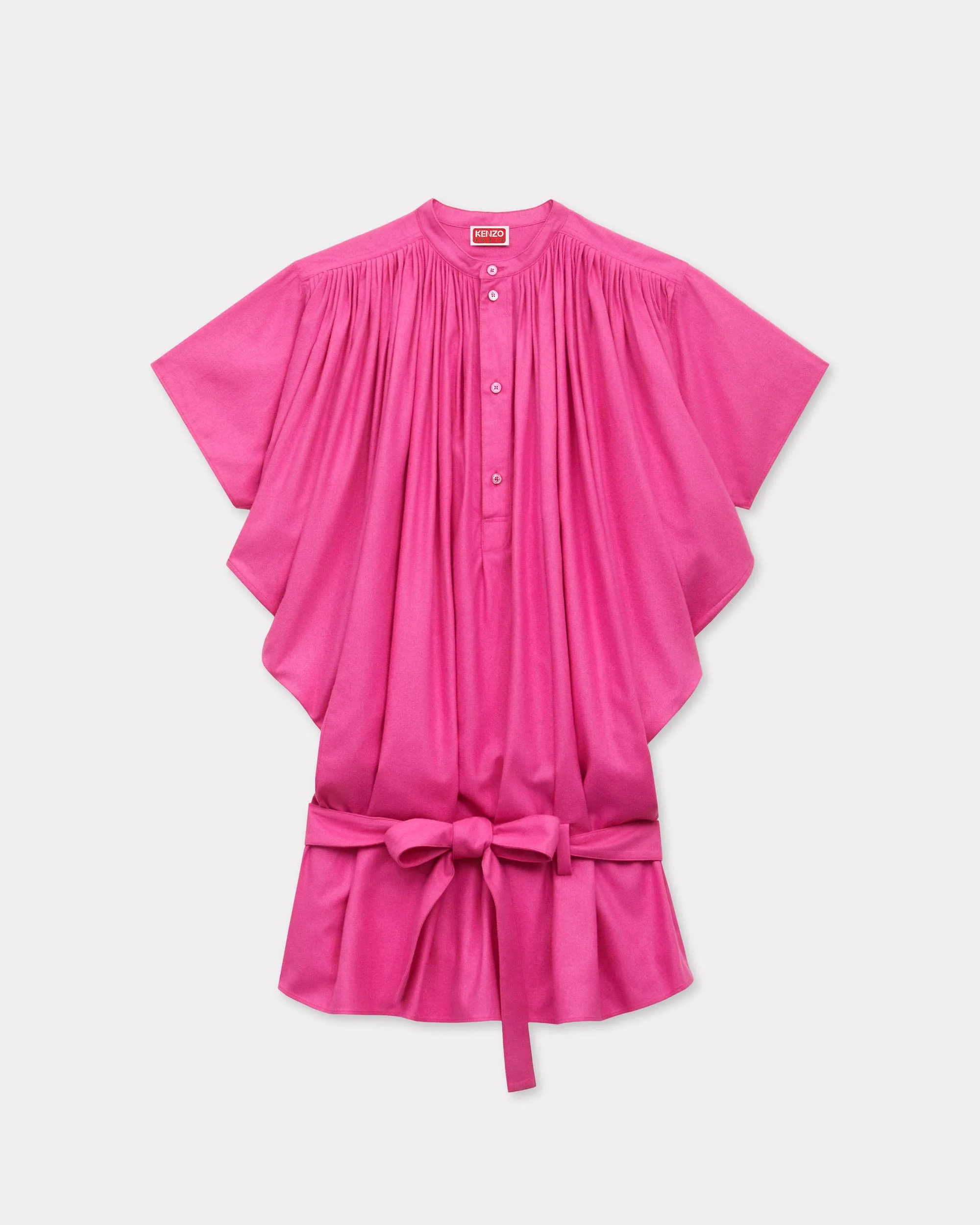 Oversized pleated dress. Silk with a textured feel. Short sleeves. Officer collar and semi opening at front with buttons. Loops around the waist and removable belt. Tonal archive signature at back and KENZO Paris mother-of-pearl engraved buttons. Can be worn as a dress or as a tunic. Product Reference: FG52RO4169EE.26 SIZE & FIT The model is 175 cm tall and is wearing size S. Oversize fit. The fit of this product is oversize. We recommend choosing one size smaller than your usual size. COMPOSITION & CARE Made in Tunisia 100% silk Do not bleach Mild professional dry-cleaning in: hydrocarbons Iron at low temperature Line drying in the shade Do not tumble dry Do not wash Do not wet-clean