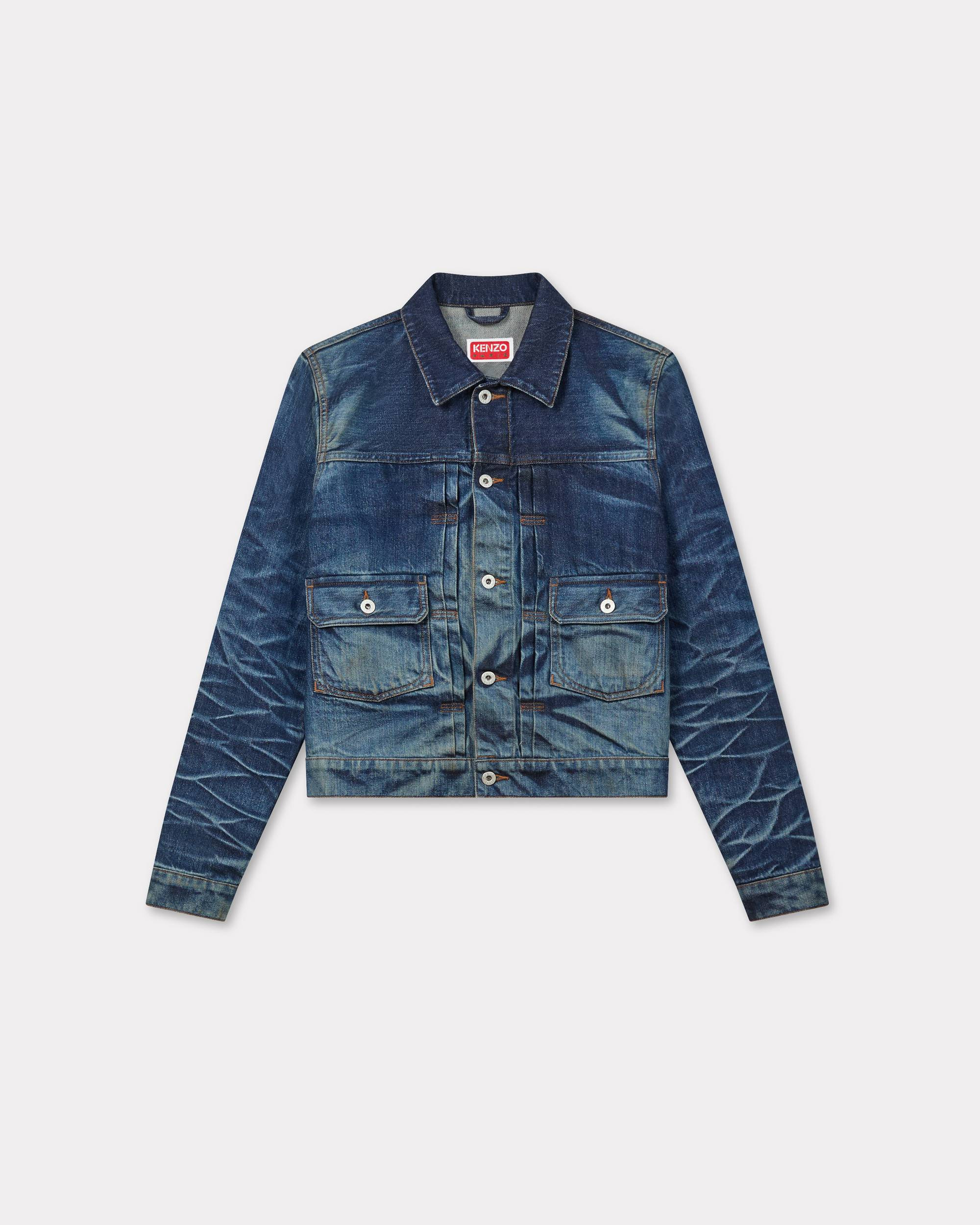 Slim pleated trucker in jacket. Stone bleach dirty denim. Kuroki Japanese denim. Two chest pockets & cinch buckle. 'KENZO Paris' leather jacron on the bottom back and 'KENZO Paris' buttons. Each piece will have different effects and will be unique. Product Reference: FF65DV3126I7.DY SIZE & FIT The male model is 185 cm tall and is wearing size M. Back length at 59 cm. Cropped slim fit. The fit of this product is cropped and slim. We recommend choosing one size larger than your usual size. COMPOSITION & CARE Made in Portugal 100% cotton