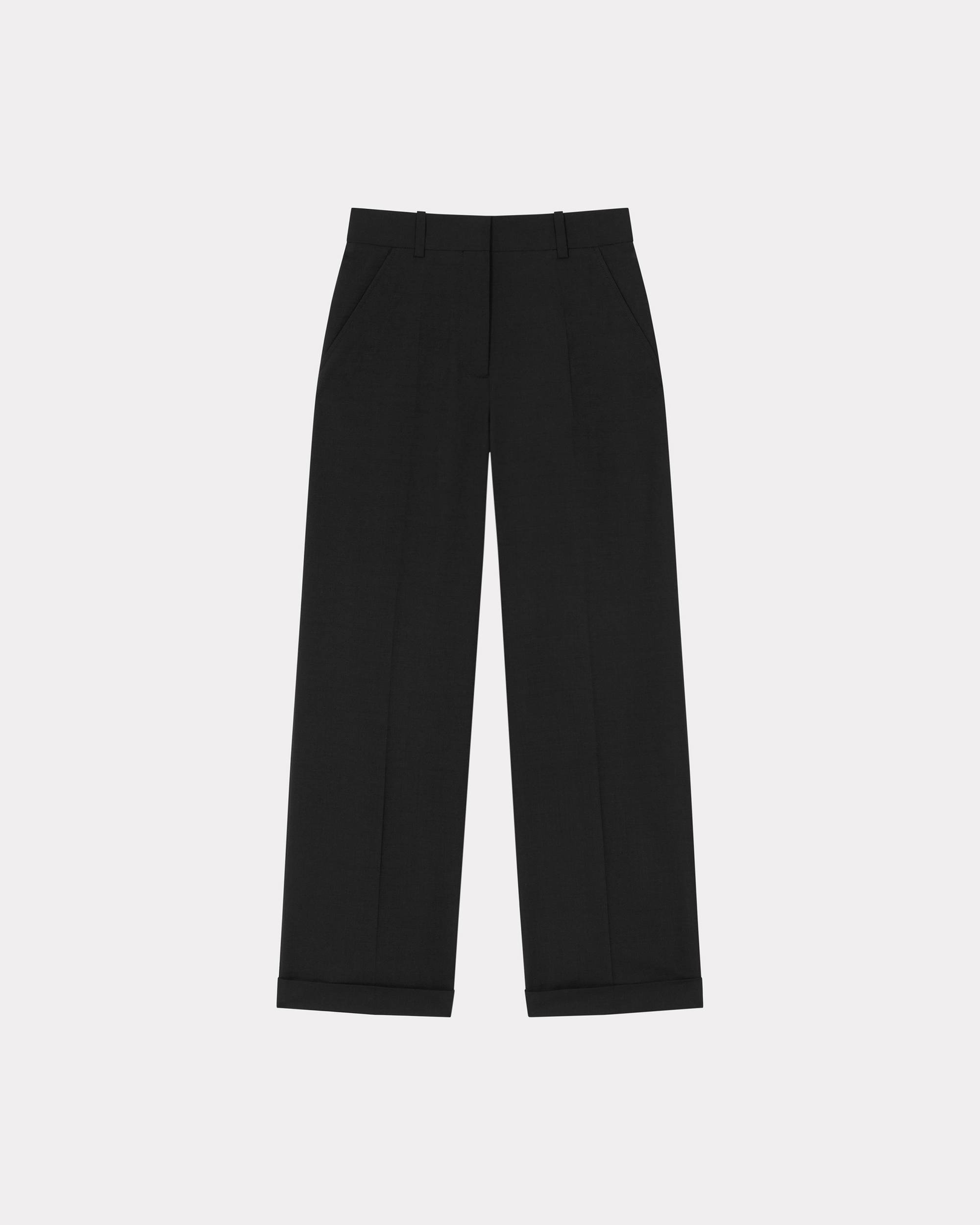 Cool wool tailored pants. Regular waist. Straight leg. Elongating front crease. Side pockets at front. Jetted pockets with flap at back. Basic belt loop with two crossed loops at back. Cuffs and hidden zip & button closure. Boke flower button. 'Kenzo Paris' label at back. Product Reference: FE52PA0869RB.99 SIZE & FIT Leg length at 103 cm. The model is 175 cm tall and wears a size S. COMPOSITION & CARE Made in Romania 76% virgin wool, 23% cotton, 1% elastane Do not bleach Mild professional dry-cleaning in: hydrocarbons Iron at low temperature Line drying in the shade Do not tumble dry Do not wash Do not wet-clean