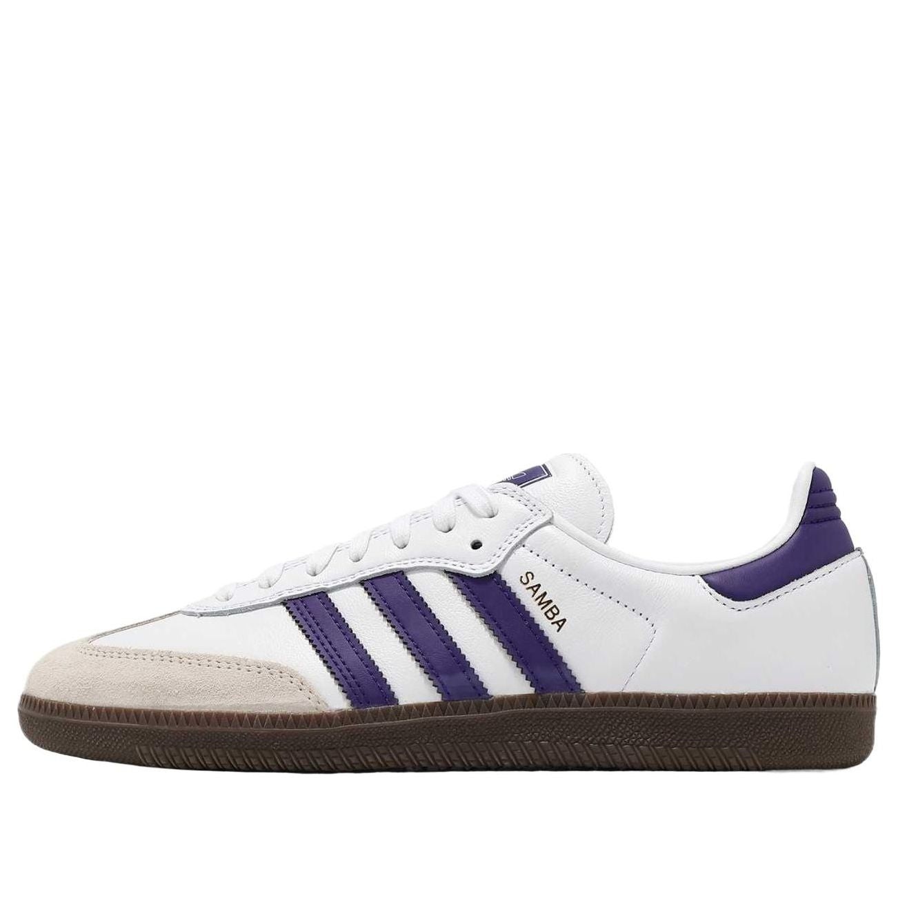 PRODUCT INFORMATION Model No: IE6613 Closure: Lacing Release Date: 2024-09-20 Upper Material: Leather Thickness: Regular Sole Colorway: Cloud White/Collegiate Purple/Gold Metallic Toe Type: Round Toe Upper: Low Top Sole Material: Rubber Sole Color: white Series: Samba Nickname: Cloud White Collegiate Purple Gold Metallic Occasion: lifestyle