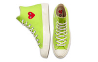 PRODUCT INFORMATION Model No: 168299C Closure: Lacing Release Date: 2020-04-01 Colorway: Green Heel Type: Flat heel Toe Type: Round Toe Sole Material: Rubber Sole Functionality: Slip-resistant/Wearable Color: green Series: COMME des GARCONS PLAY Sub Series: Chuck 70 High Nickname: Bright Green Occasion: lifestyle Take your style up a notch with the Converse Comme des Garcons PLAY x Chuck 70 High Bright Green. This shoe is built with canvas for a durable yet comfortable fit, and features CDG PLAY's heart logo on the side wall for a touch of style. Metal eyelets support the lacing system, while underfoot, a vulcanized midsole provides a classic look. A gum rubber outsole offers traction and durability.